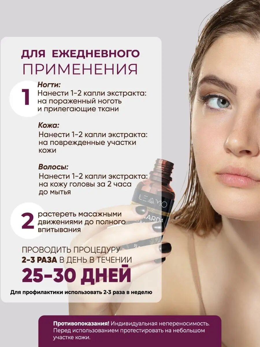 | Способ применения | Для ежедневного применения: нанести 1-2 капли экстракта на поврежденные участки кожи лица, тела, головы, на пораженные ногти |