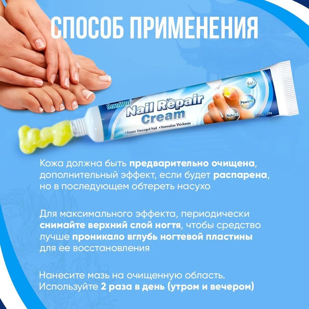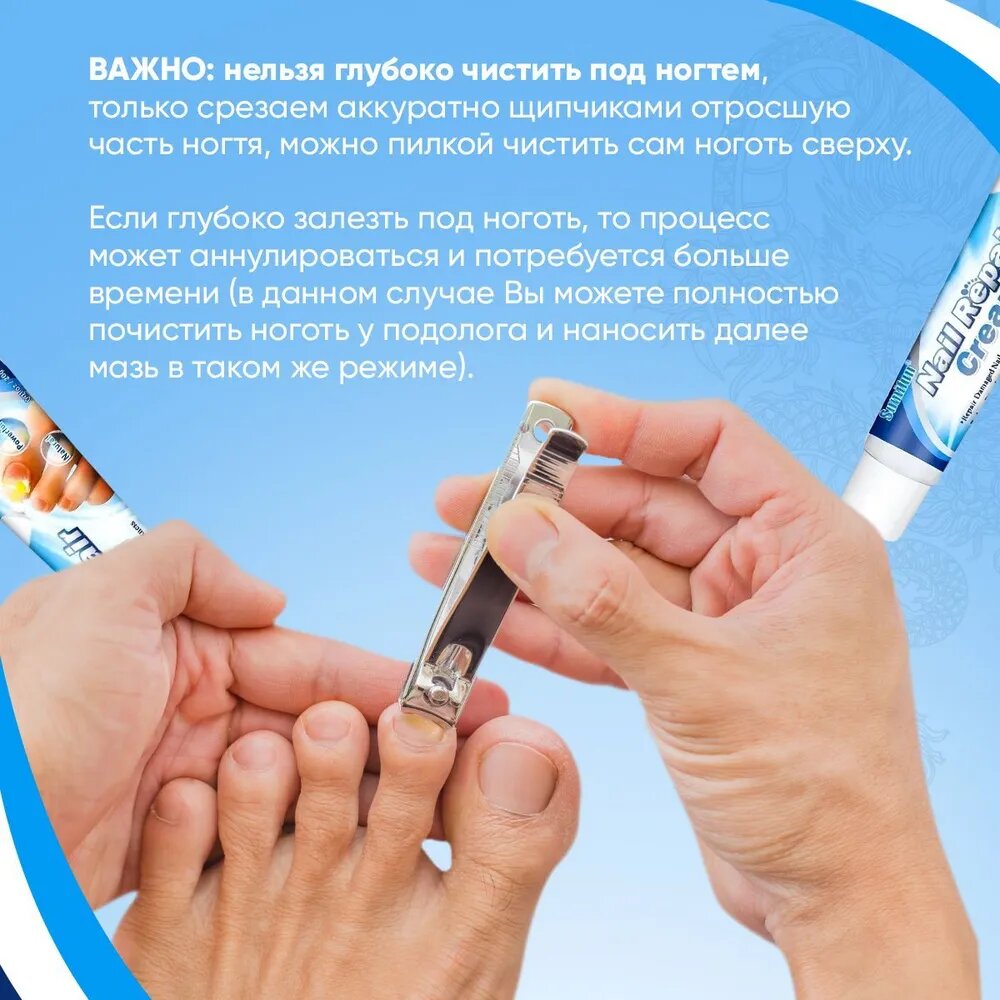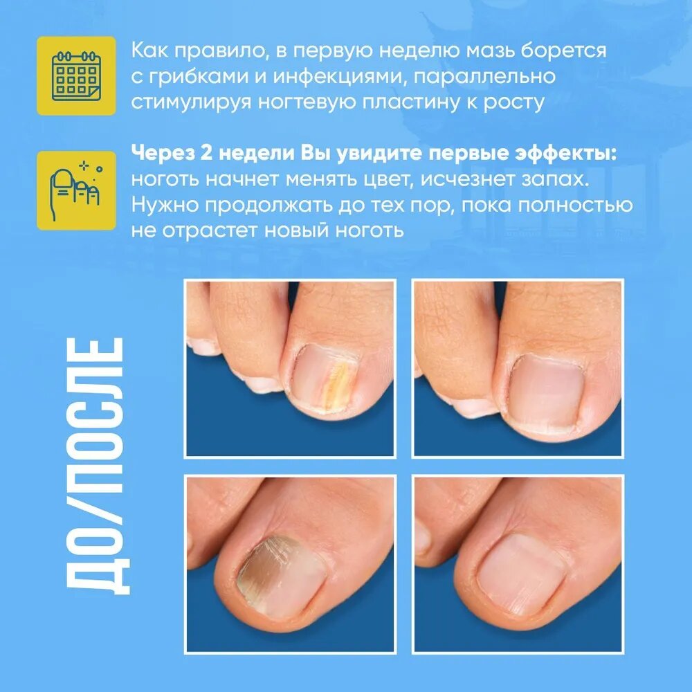 | Способ применения | Кожа должна быть предварительно очищена, дополнительный эффект, если будет распарена, но в последующем обтереть насухо. Для максимального эффекта, периодически снимайте верхний слой ногтя, чтобы средство лучше проникало вглубь ногтевой пластины для ее восстановления. Нанесите мазь на очищенную область. Используйте 2 раза в день (утром и вечером). Как правило, в первую неделю мазь борется с грибками и инфекция, параллельно стимулируя ногтевую платину к росту, через 2 недели Вы увидите первые эффекты: ноготь начнет менять цвет, исчезнет запах. Нужно продолжать до тех пор, пока полностью не отрастет новый ноготь. ВАЖНО: нельзя глубоко чистить под ногтем, только срезаем аккуратно щипчиками отросшую часть ногтя, можно пилкой чистить сам ноготь сверху. Если глубоко залезть под ноготь, то процесс может аннулироваться и потребуется больше времени (в данном случае Вы можете полностью почистить ноготь у подолога и наносить далее мазь в таком же режиме). |