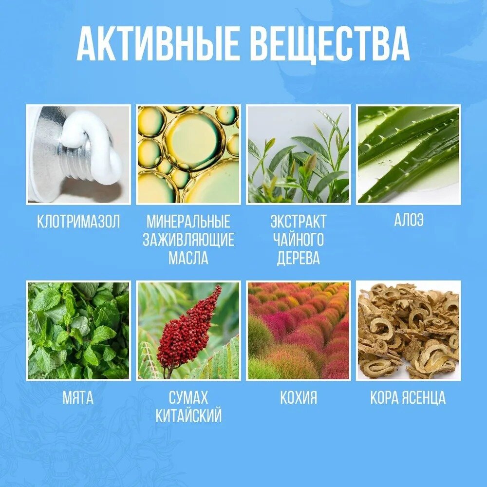 | Состав | клотримазол; минеральные заживляющие масла, экстракт чайного дерева, алоэ, мята, сумах китайский, кохия, кора ясенца. |