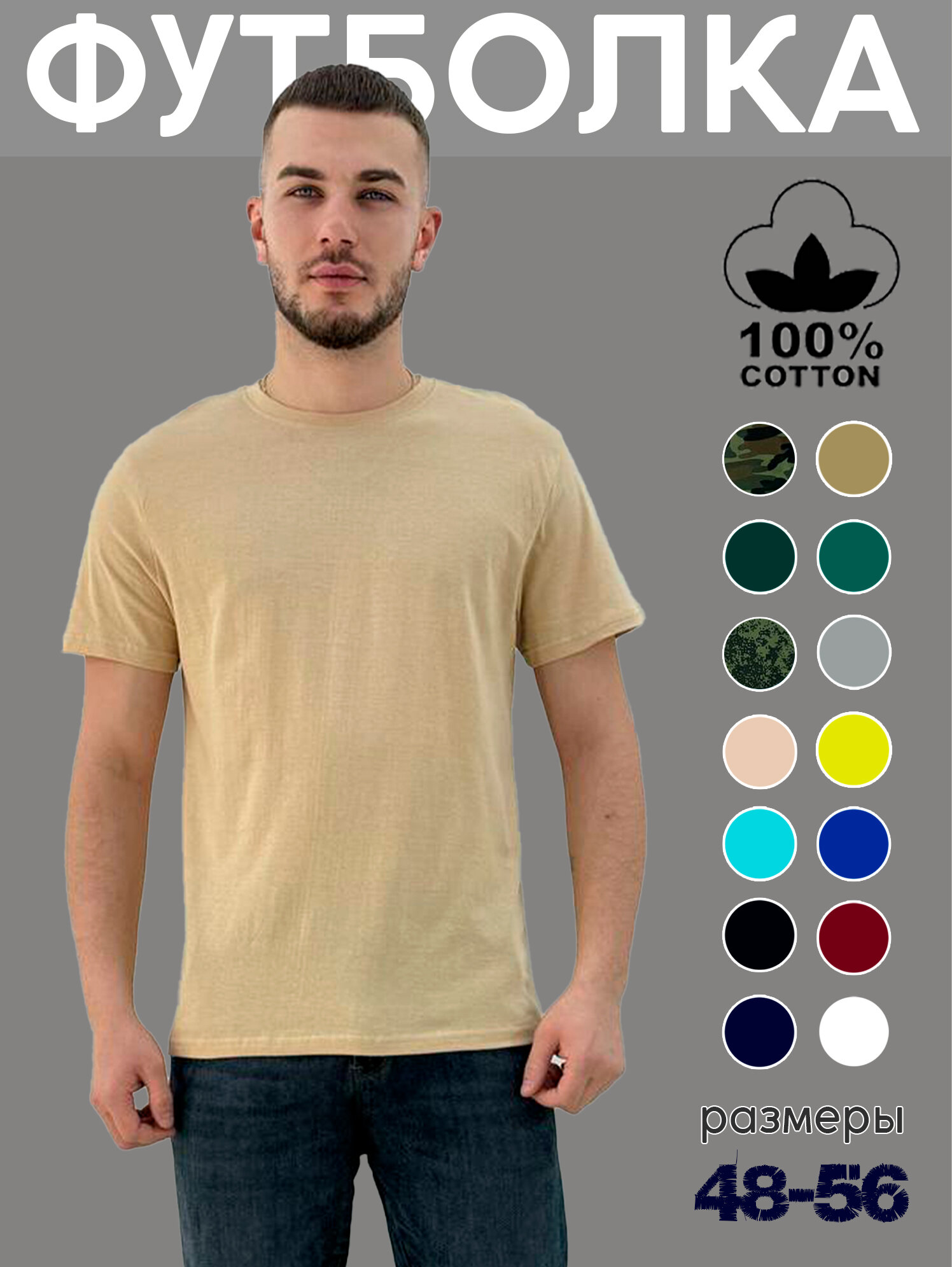 Футболка Zobi Футболка ZOBI мужская однотонная без принта, размер 56, бежевый