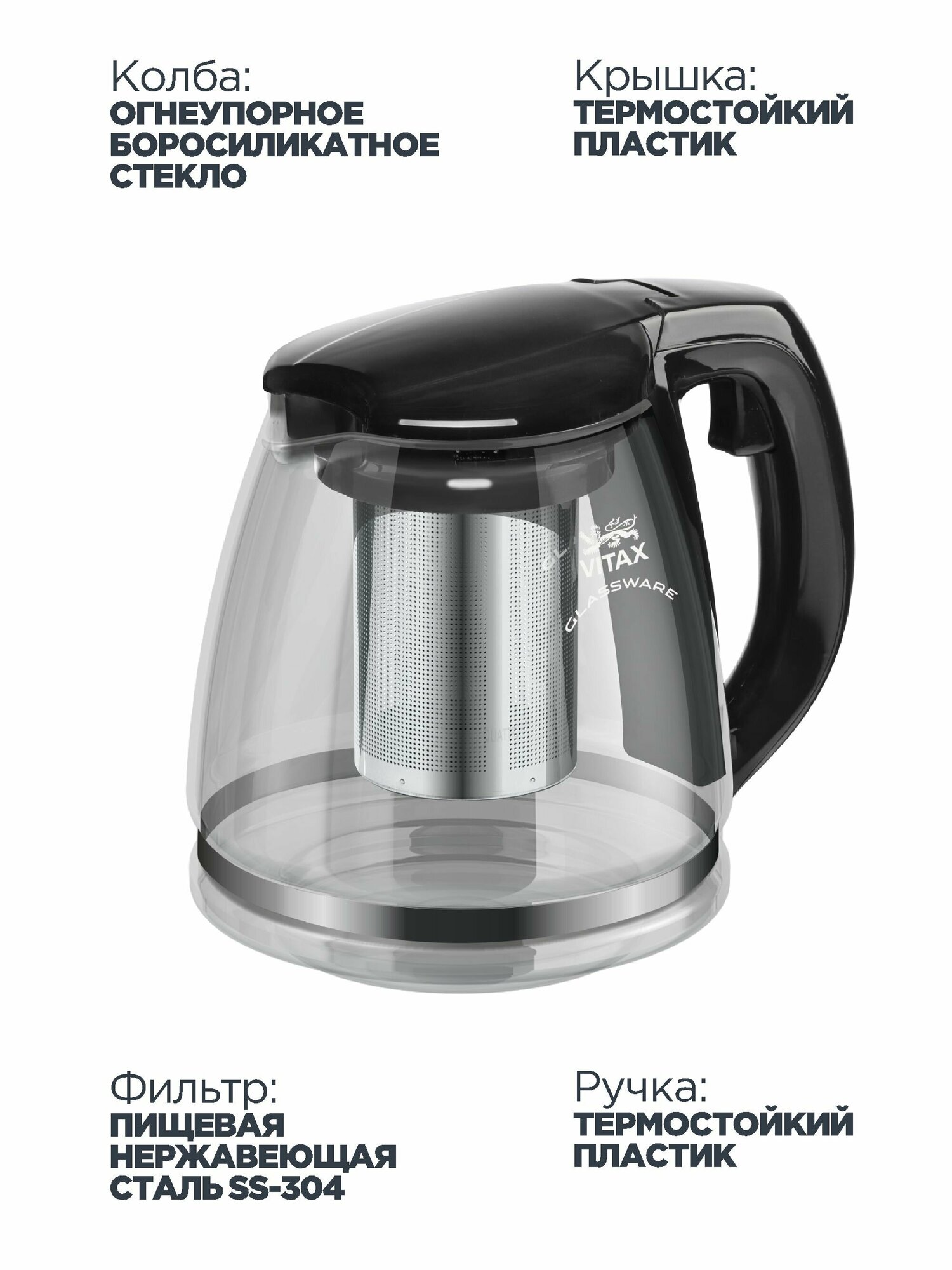 Чайник из жаропрочного стекла Vitax с ситечком, для заваривания чая и трав. Кувшин для приготовления напитков . Графин объемом 1,5 литра.