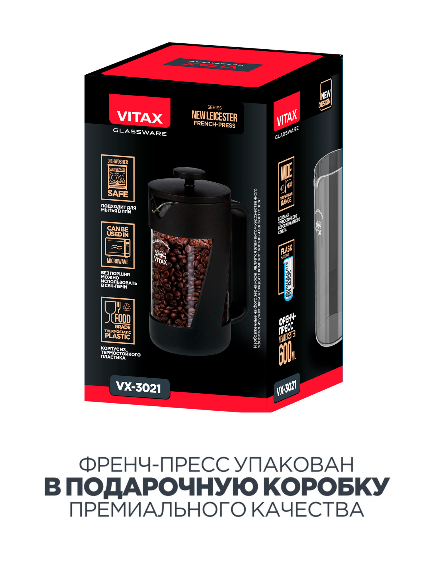 Френч-пресс Vitax "New Leicester", пластик, стекло, нержавеющая сталь, 600 мл (VX-3021)