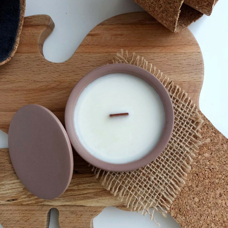 Свеча ароматическая с деревянным фитилём "Ваниль - Апельсин" из соевого воска в стакане из гипса