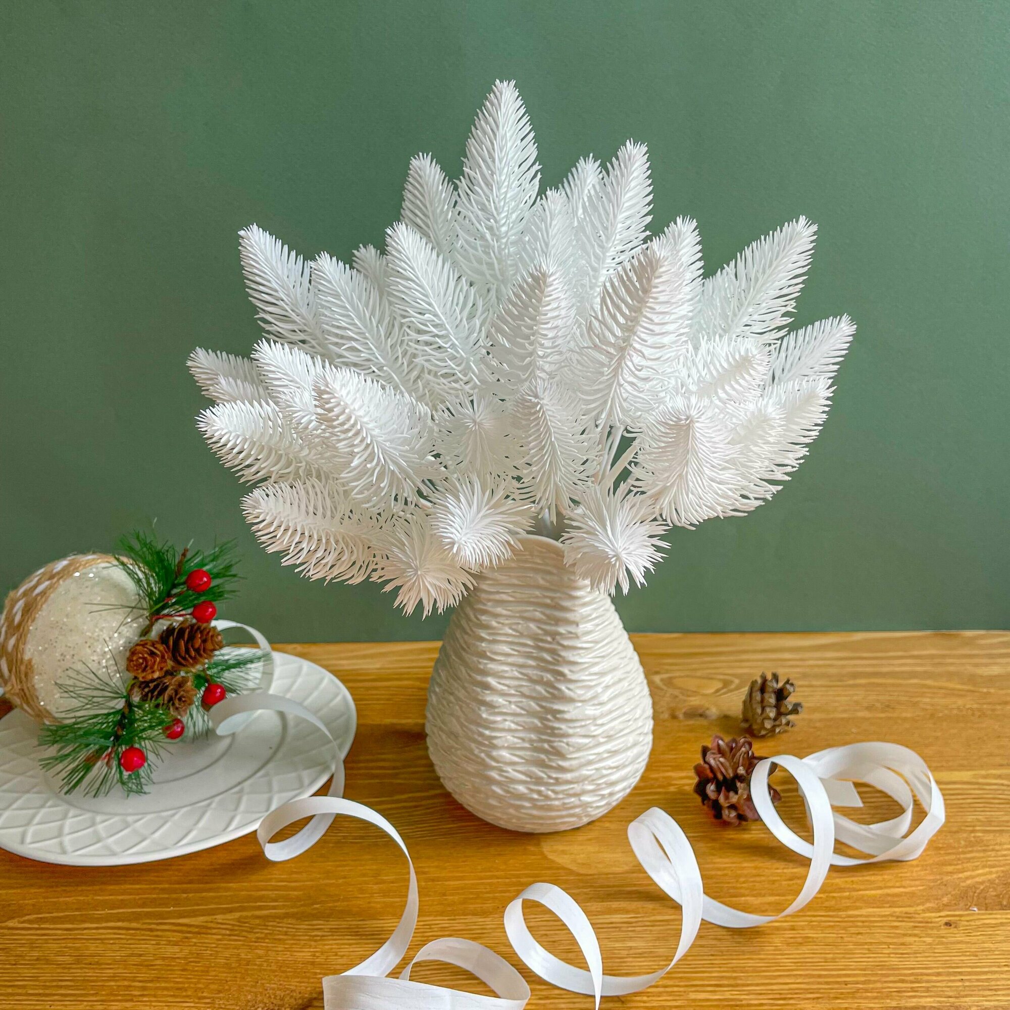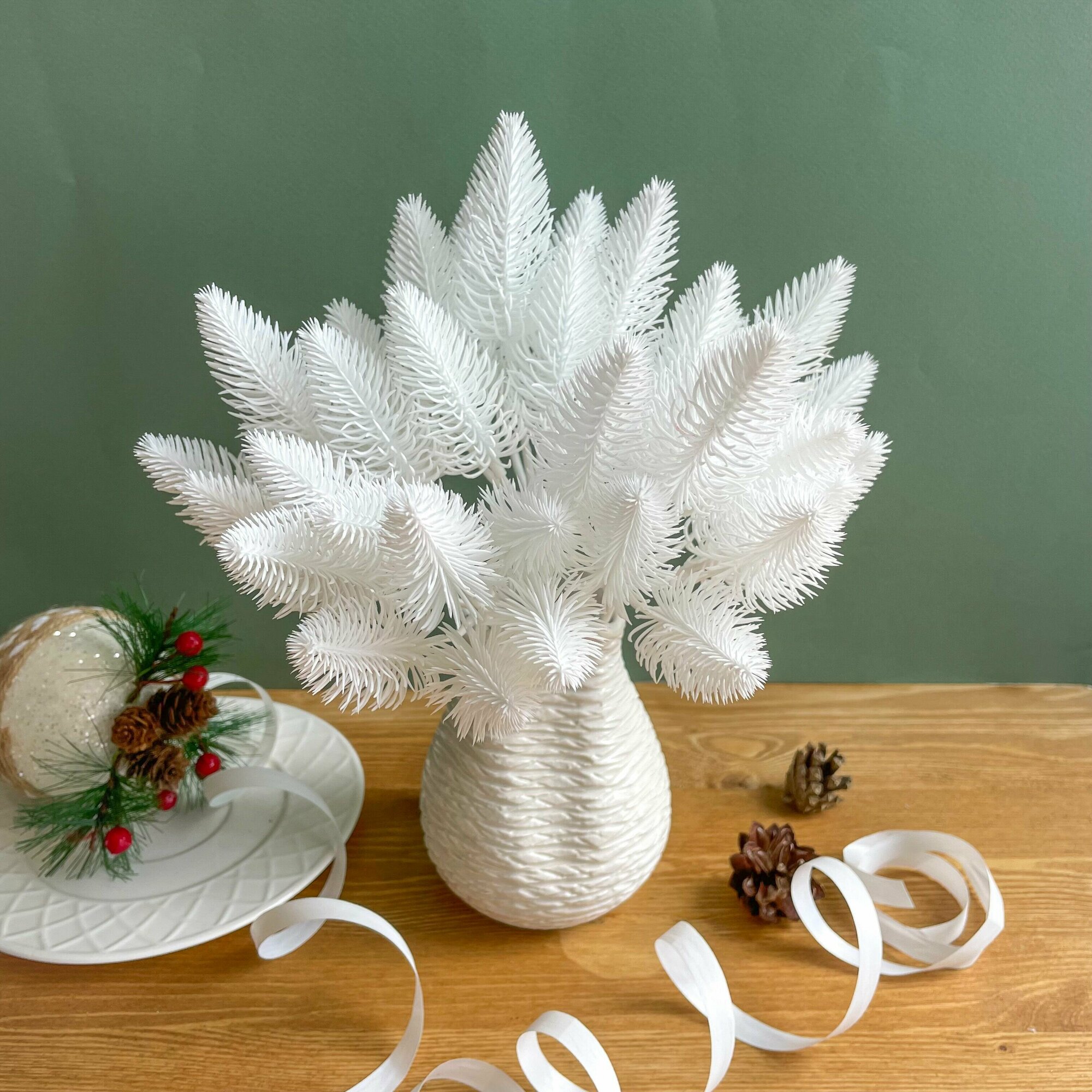 Еловая ветка искусственная, набор 3 ветки, 1 белая и 2 зеленые, декор зимний, рождественский, 42 см