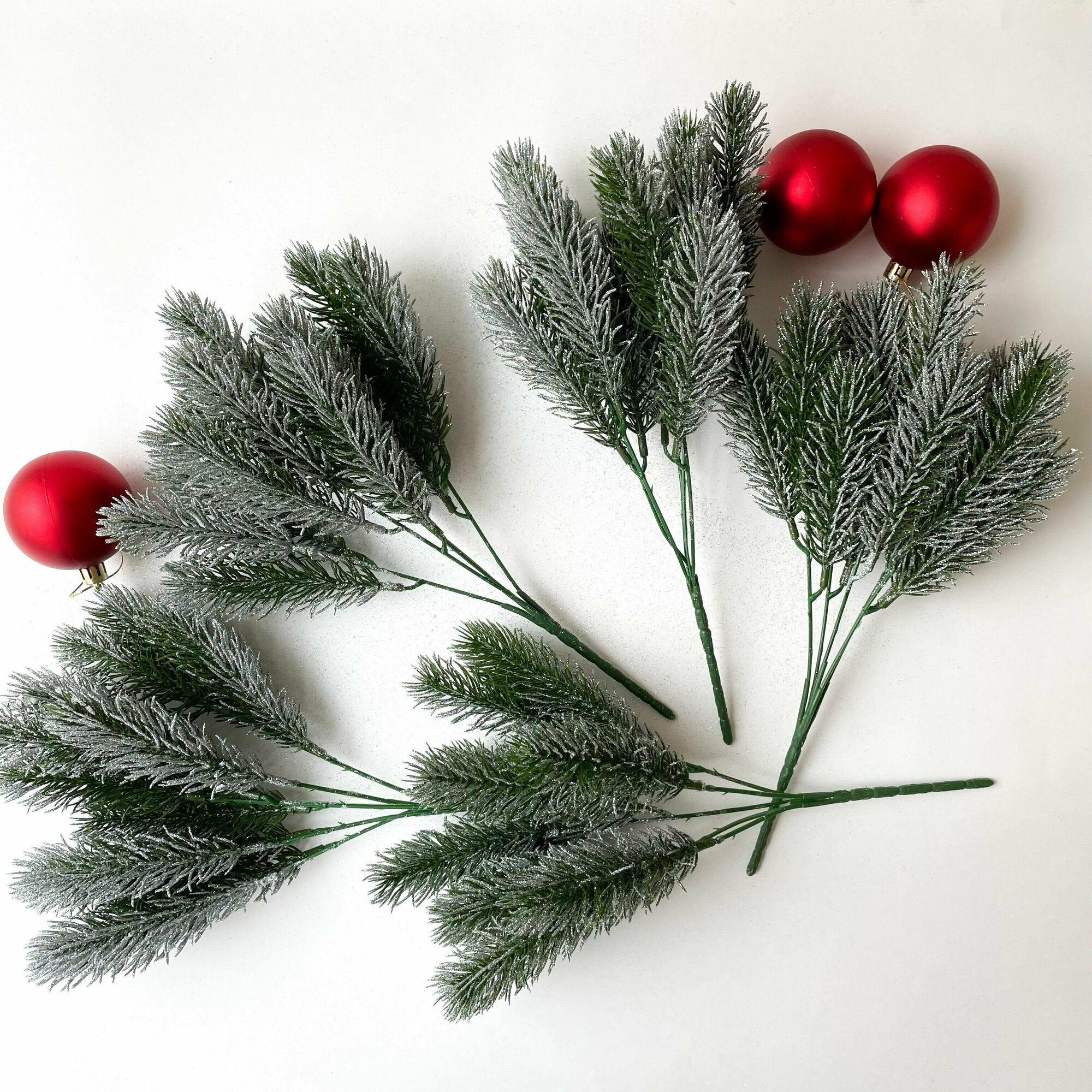 Еловая ветка белая стильная, декор зимний, рождественский, набор 3 ветки по 13 лапок, 42 см