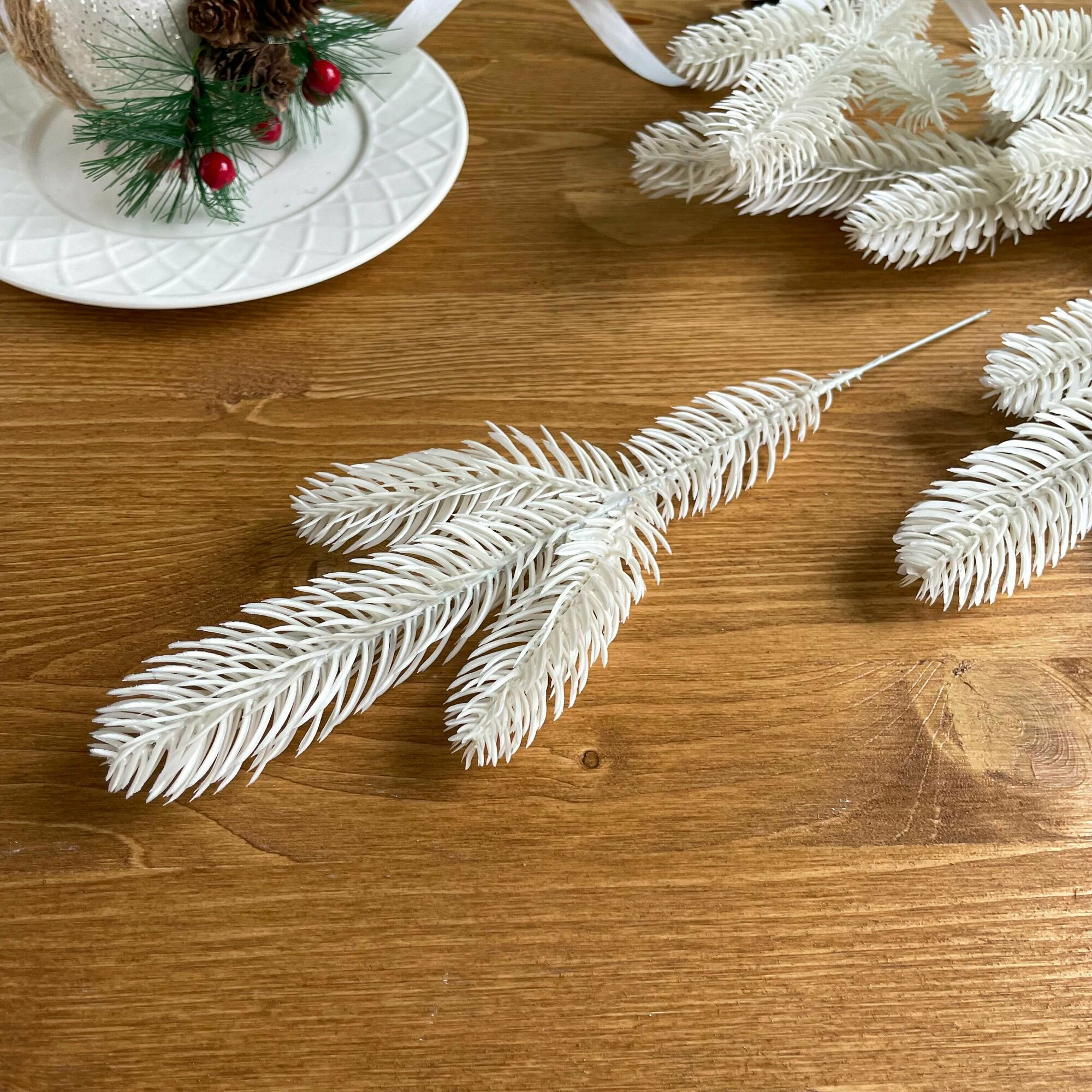 Еловая ветка белая стильная, декор зимний, рождественский, набор 3 ветки по 13 лапок, 42 см