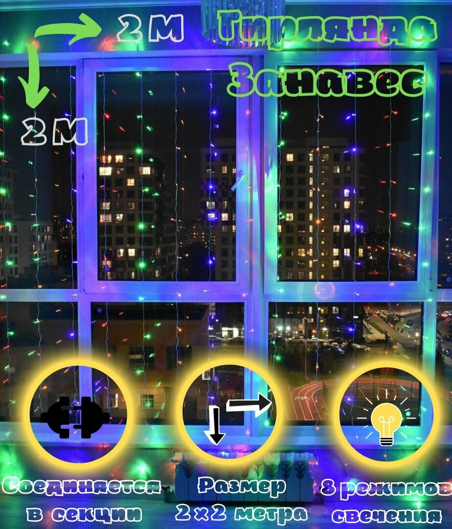 Гирлянда светодиодная Занавес/Штора/на окно / Новогодняя гирлянда дождик 2 на 2 метра Разноцветная интересное: