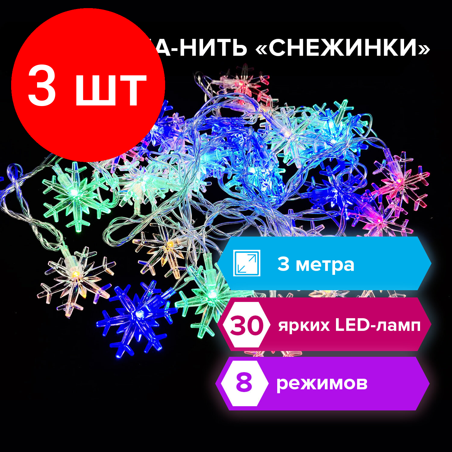 СохранитьКомплект 3 шт, Электрогирлянда светодиодная золотая сказка "Снежинки", 30 ламп, 3 м, многоцветная, 591268 интересное: