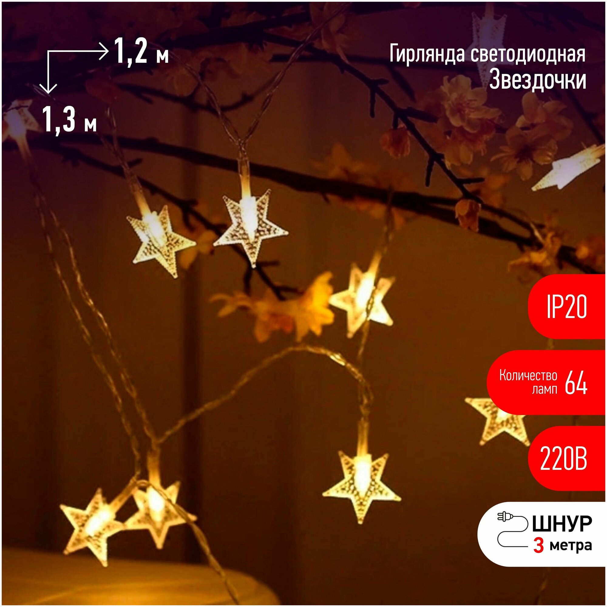 ЭРА Светодиодная новогодняя гирлянда ENIZ64W Звездочки 1,21,3 м теплый белый 64LED IP20 Б0051876