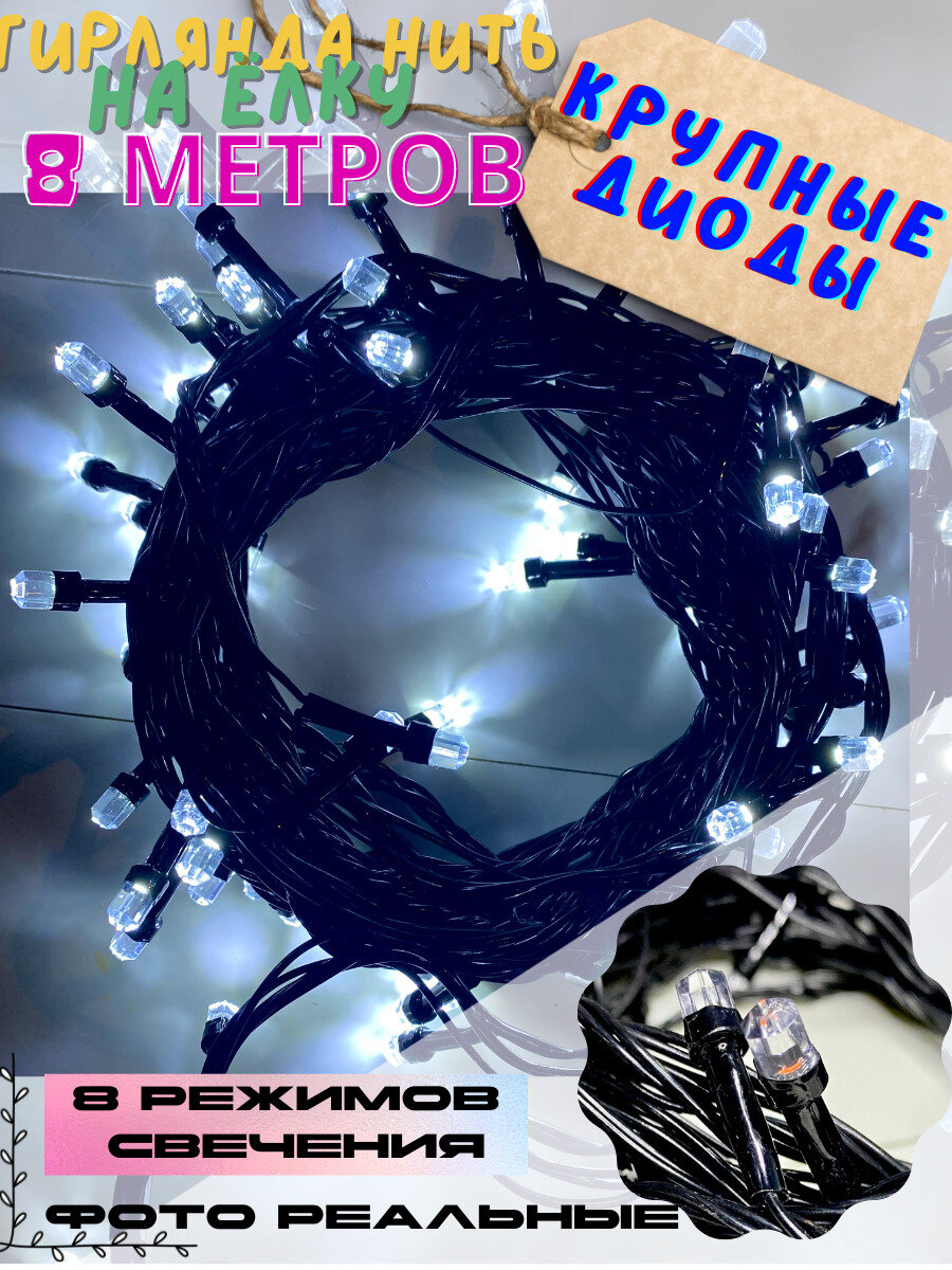 Гирлянда светодиодная нить на елку 8 метров/для дома/украшение Белая интересное: