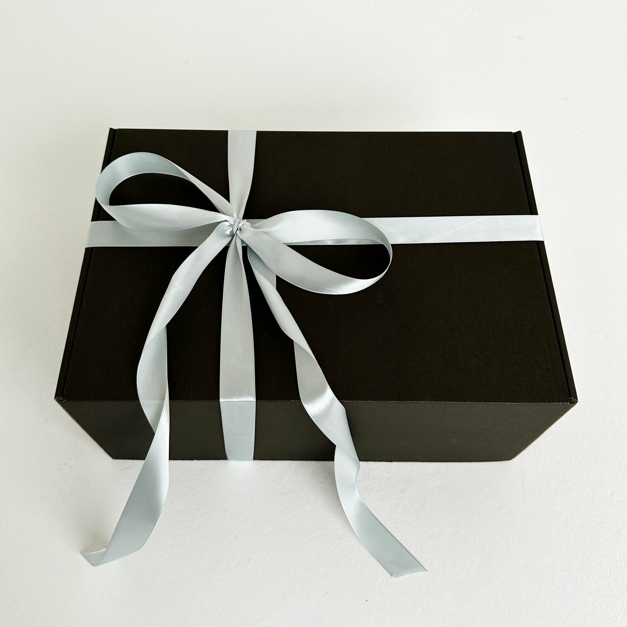 Большая подарочная коробка GILEV 37x37x14 см с синей лентой и наполнителем крафт