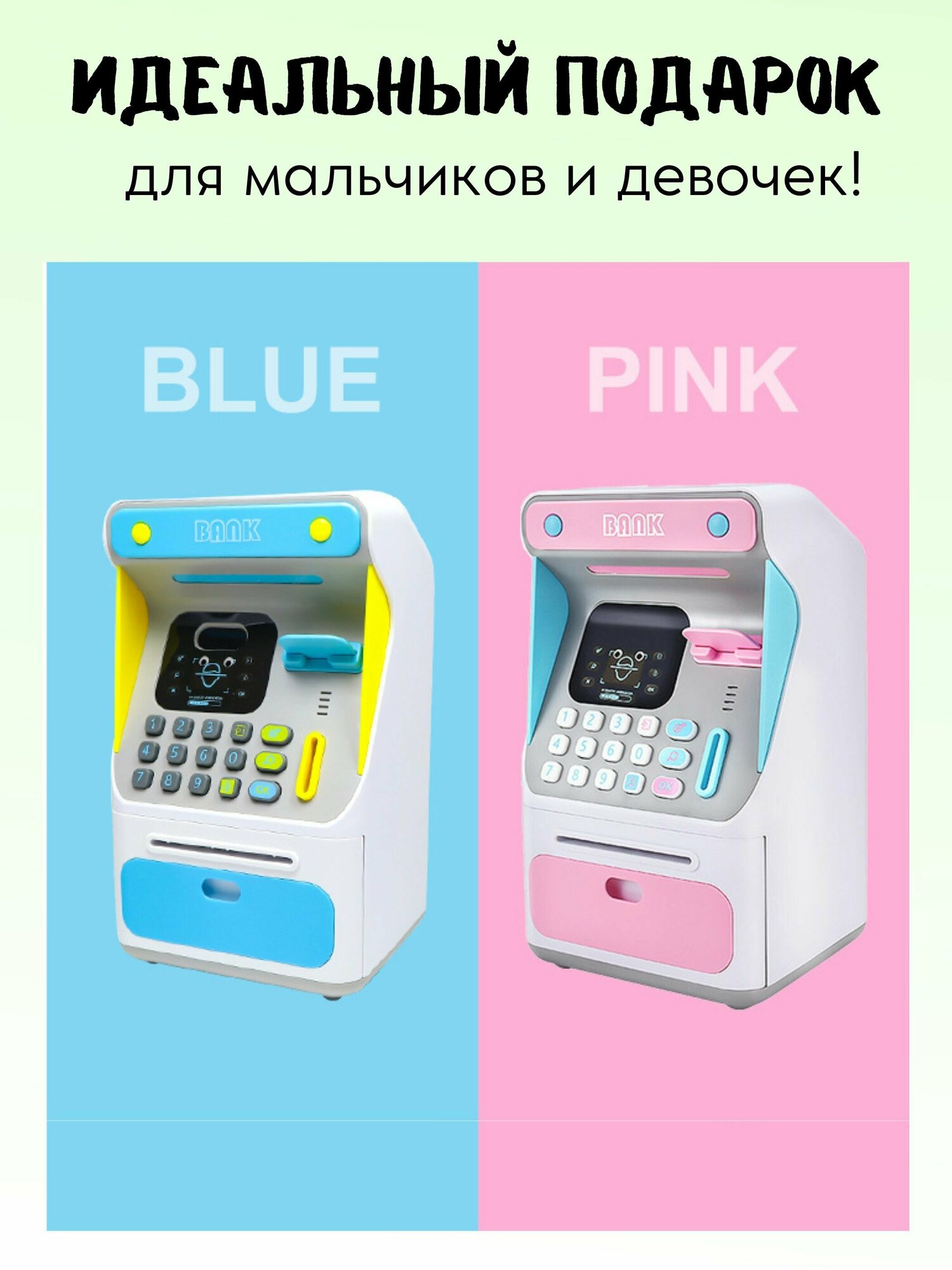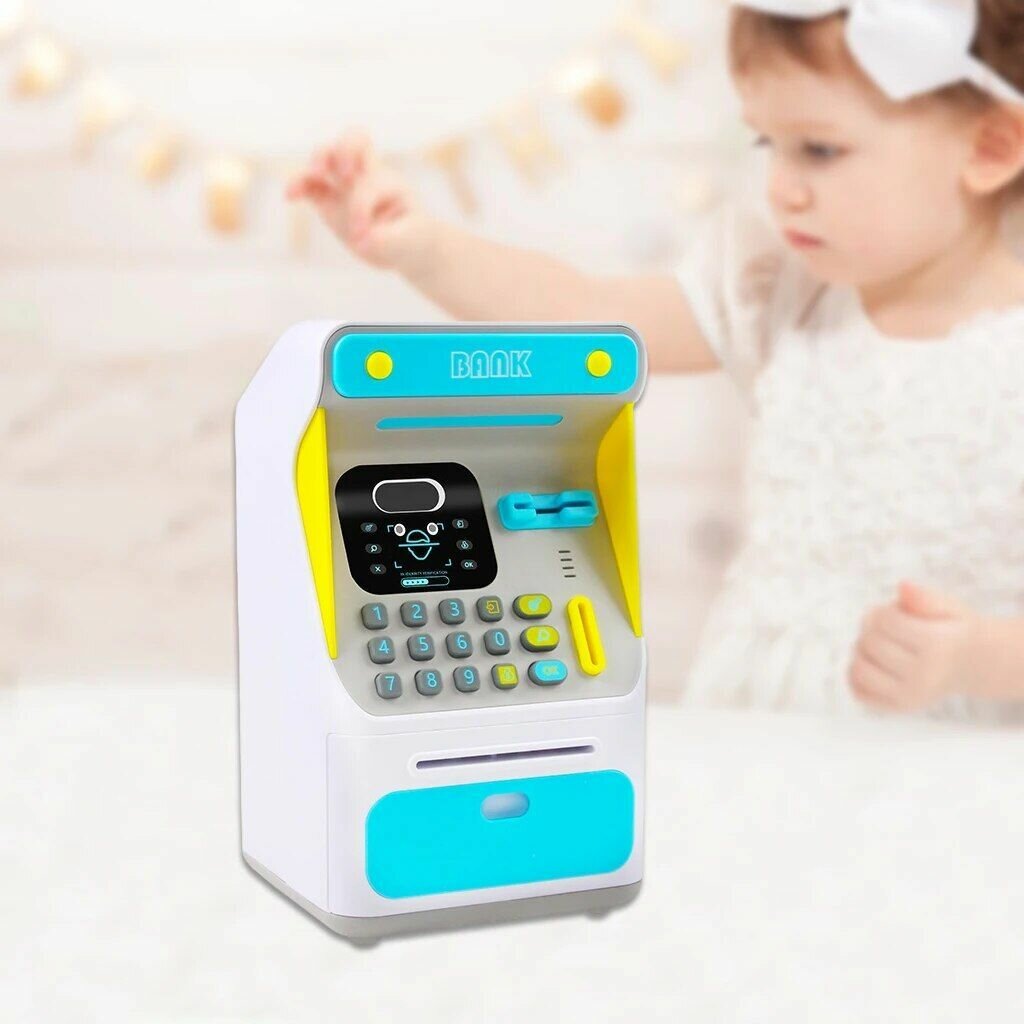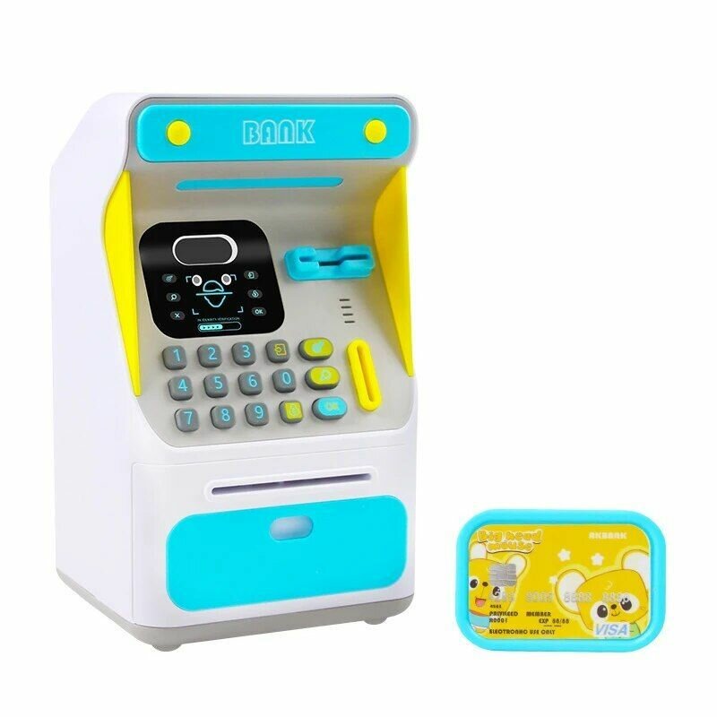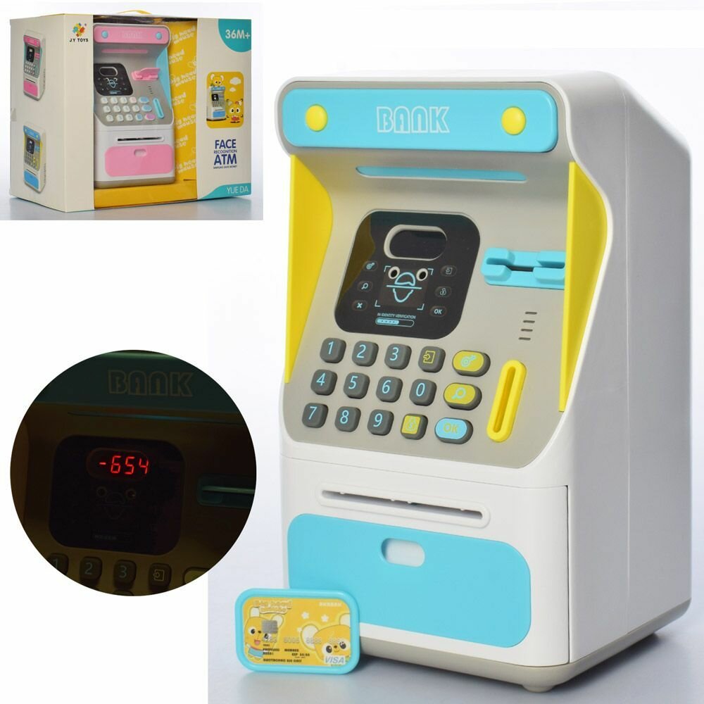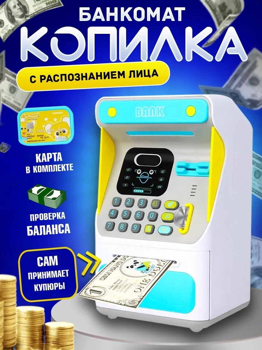 Интерактивная копилка-банкомат с распознованием лица для купюр и монет, синяя интересное: