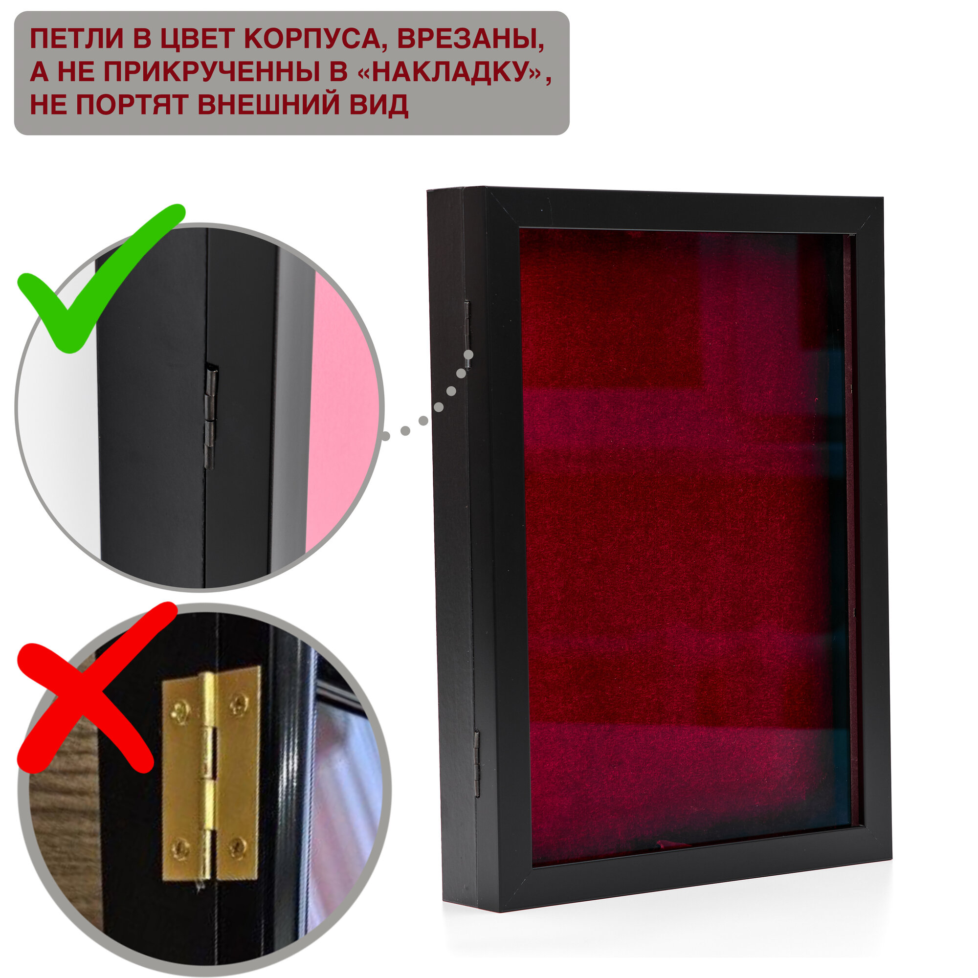 | Дополнительная информация | Цвет черный матовый, корпус МДФ, прозрачное акриловое стекло, мягкий планшет с бархатом, толщина витрины 50 мм. |