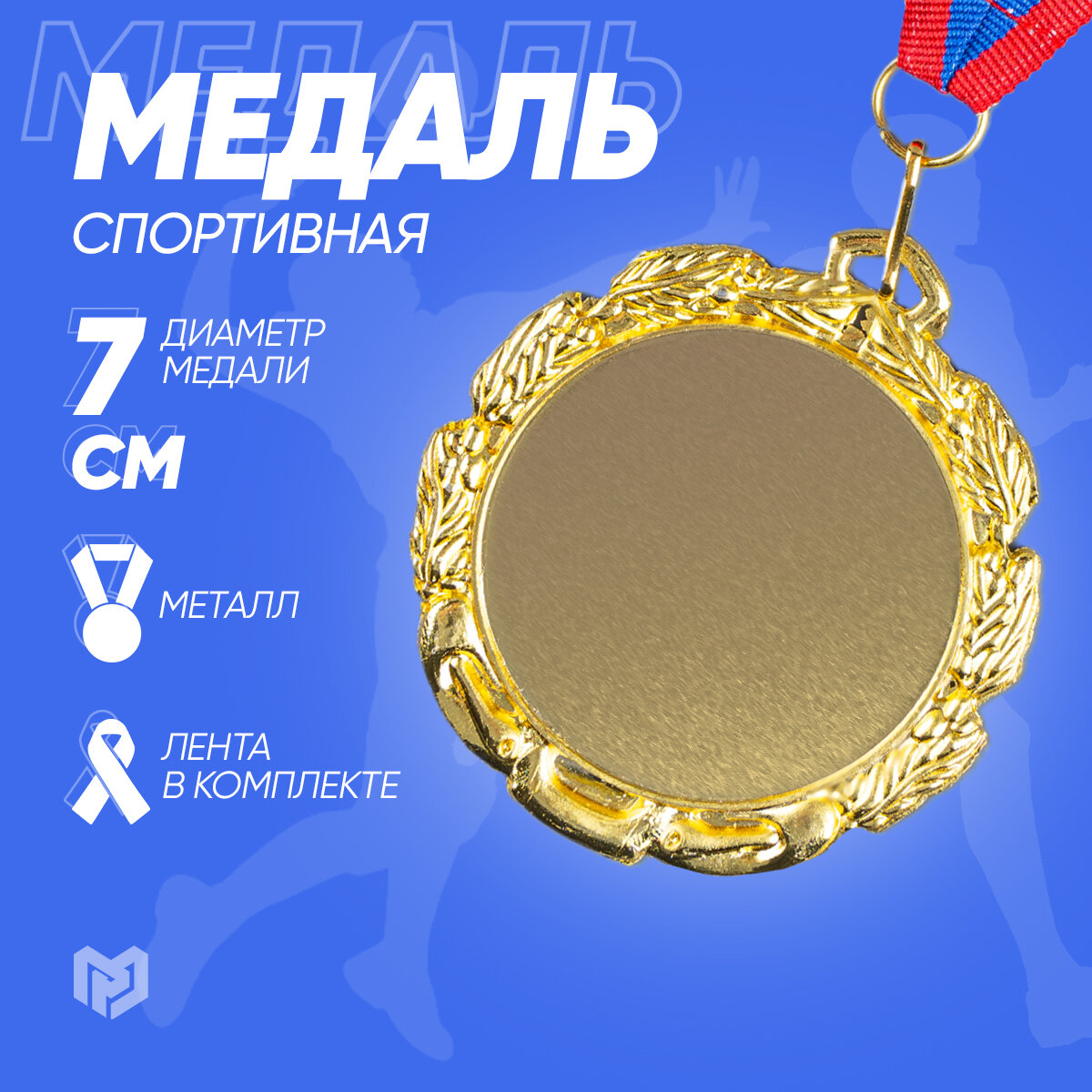 Медаль спортивная наградная под нанесение, золотой цвет, диаметр 7 см. С лентой в комплекте. интересное: