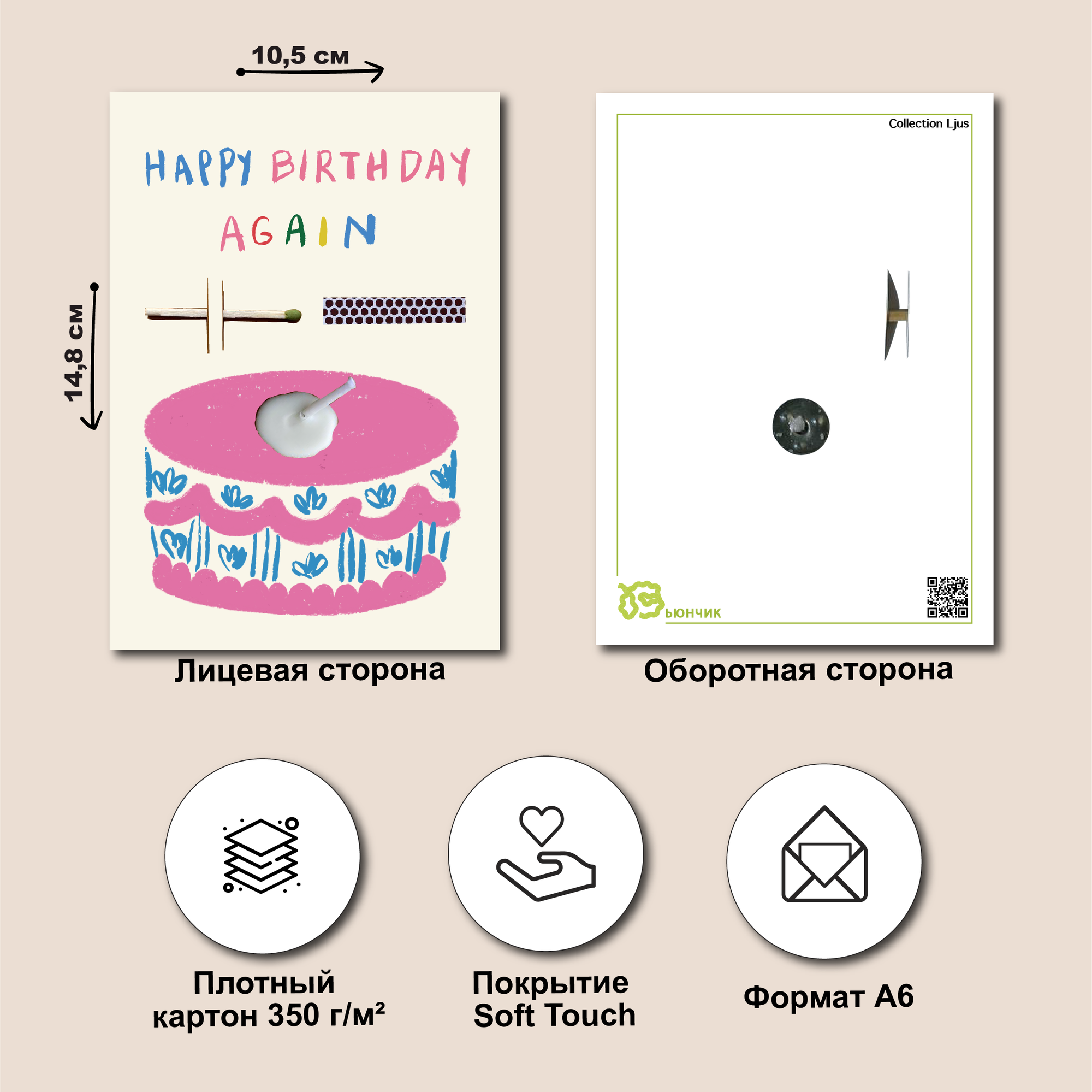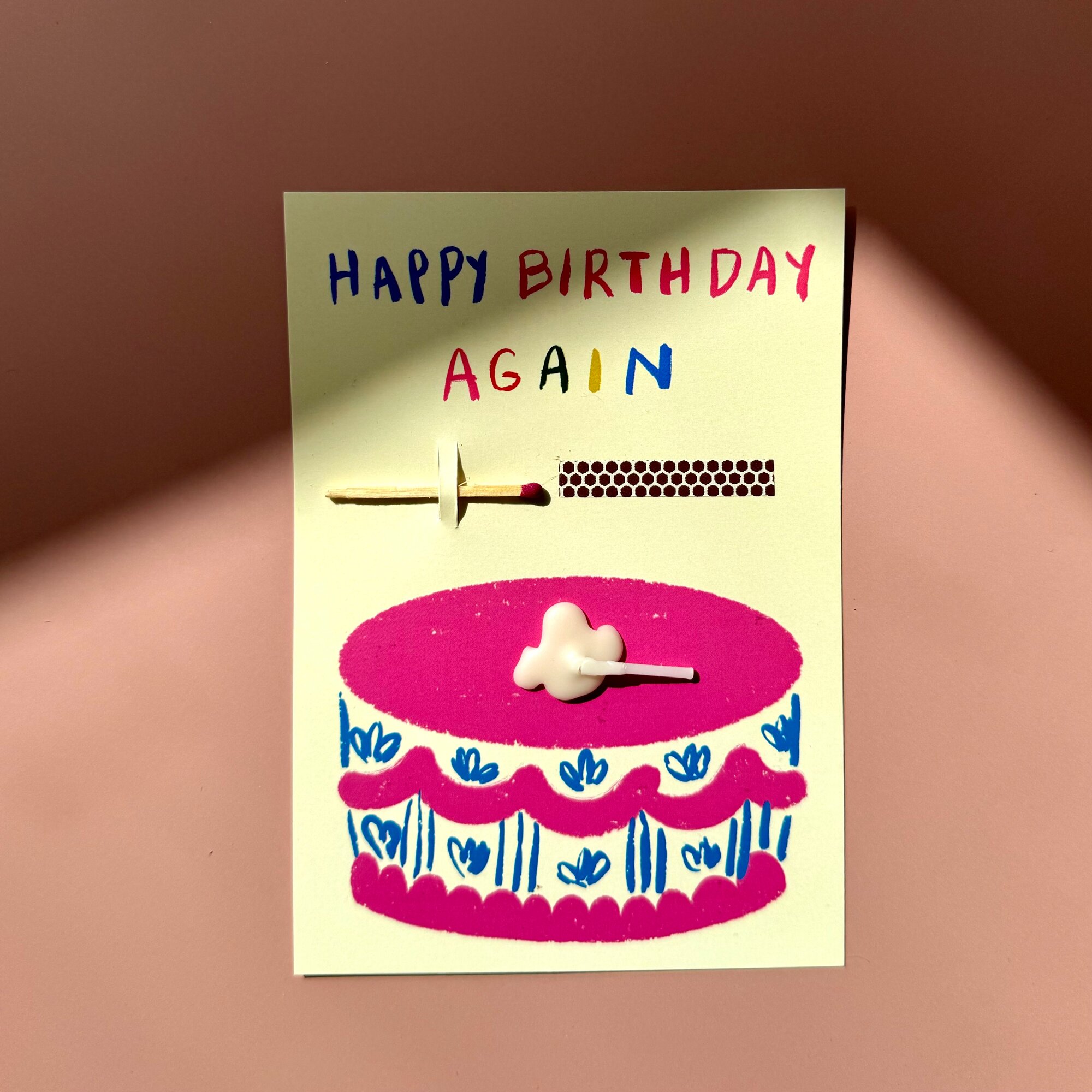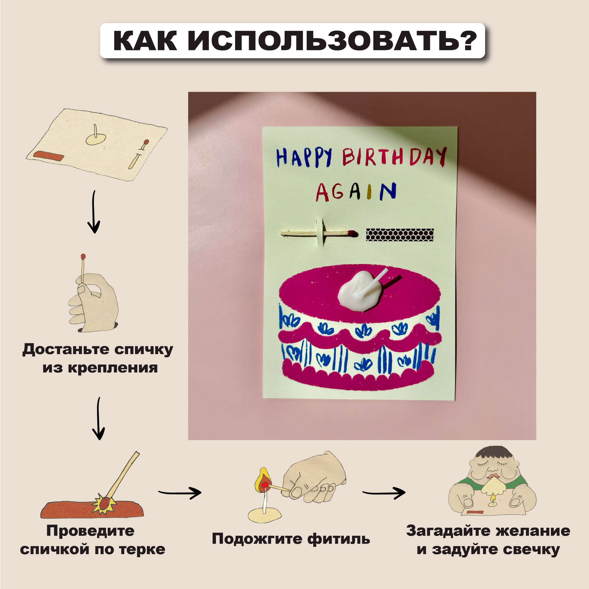 Открытка свечка "Happy birthday again" от Вьюнчик, 14,8х10,5 см (А6), стильная открытка на день рождения
