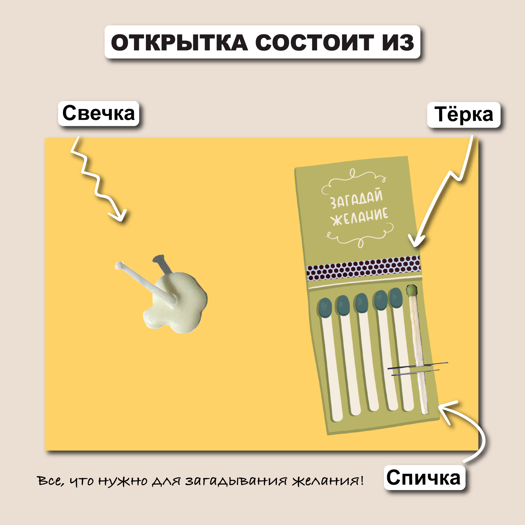 Открытка свечка "Загадай", от Вьюнчик, с крафтовым конвертом, 14,8х10,5 см (А6), открытка для загадывания желаний