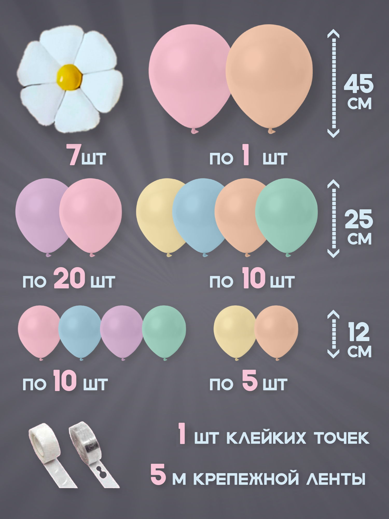 | Подробная комплектация | арка гирлянда из шаров фотозона - 1 шт.; лента для гирлянды из воздушных шаров основа 5 м. - 1шт.; клеевые точки для шаров на ленте 100 шт. - 1 шт. |
