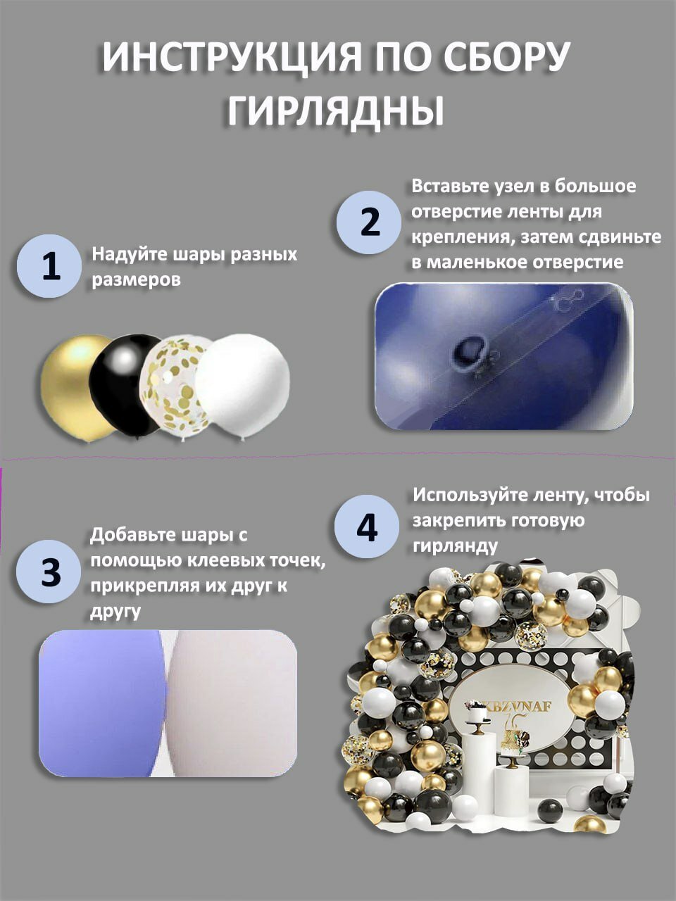 | Подробная комплектация | арка гирлянда из шаров фотозона - 1 шт.; лента для гирлянды из воздушных шаров основа 5 м. - 1шт.; клеевые точки для шаров на ленте 100 шт. - 1 шт. |