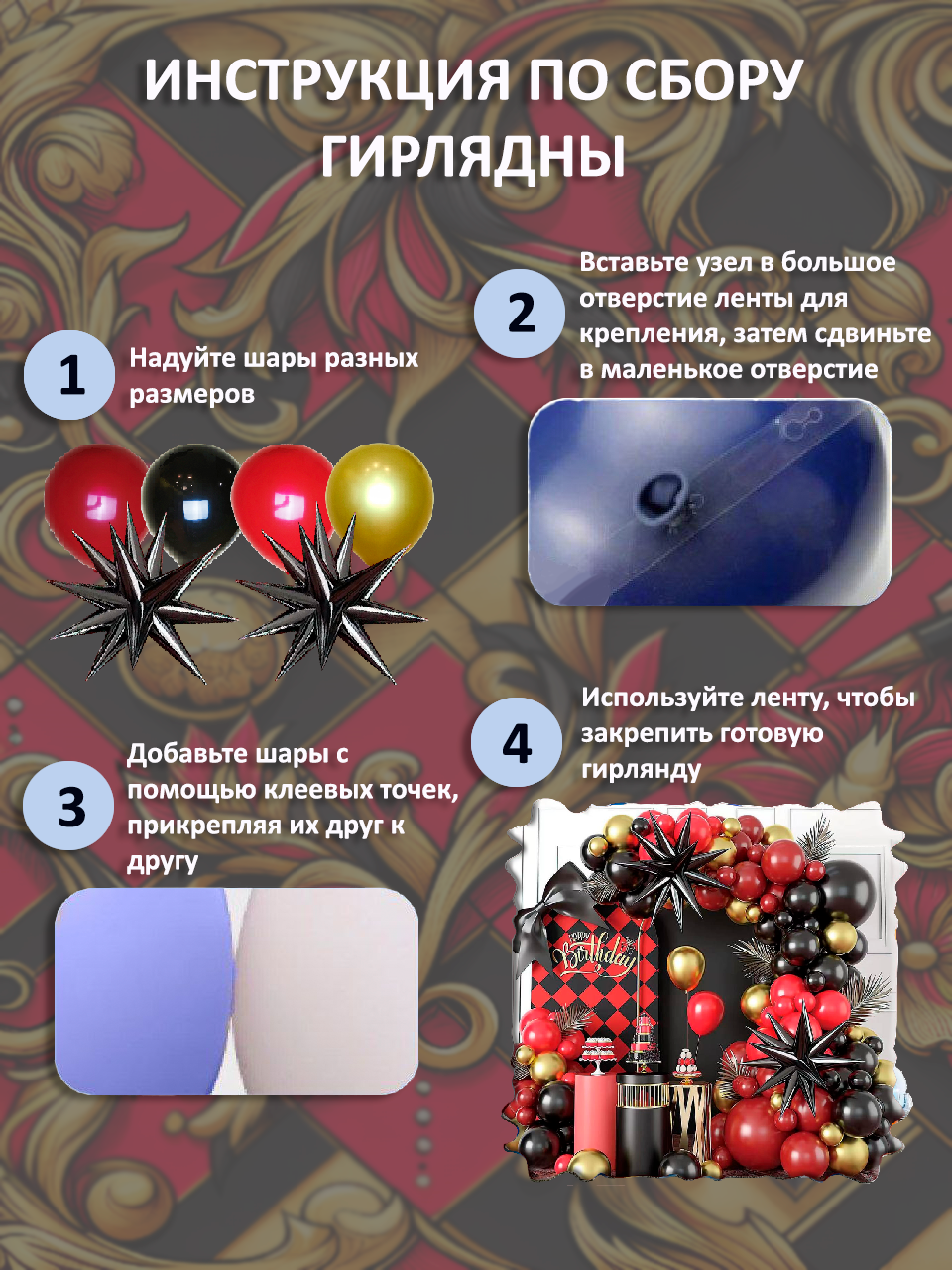 | Подробная комплектация | арка гирлянда из шаров фотозона - 1 шт.; лента для гирлянды из воздушных шаров основа 5 м. - 1шт.; клеевые точки для шаров на ленте 100 шт. - 1 шт. |