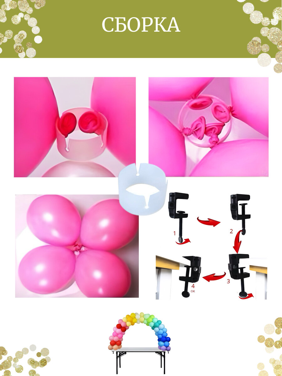 | Подробная комплектация | 1. трубки для арки -10 шт 2. зажимы для шаров - 25 шт 3. крепление к столу -2 шт |