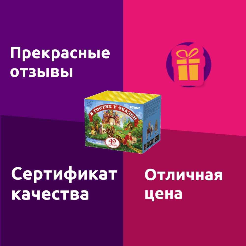 Ниже Вы можете прочитать отзывы на Салют фейерверк "В гостях у сказки" калибр 1,2" / 49 залпов, ознакомится с подробными характеристиками, посмотреть интересные обзоры и фотографии на Салют фейерверк "В гостях у сказки" калибр 1,2" / 49 залпов.