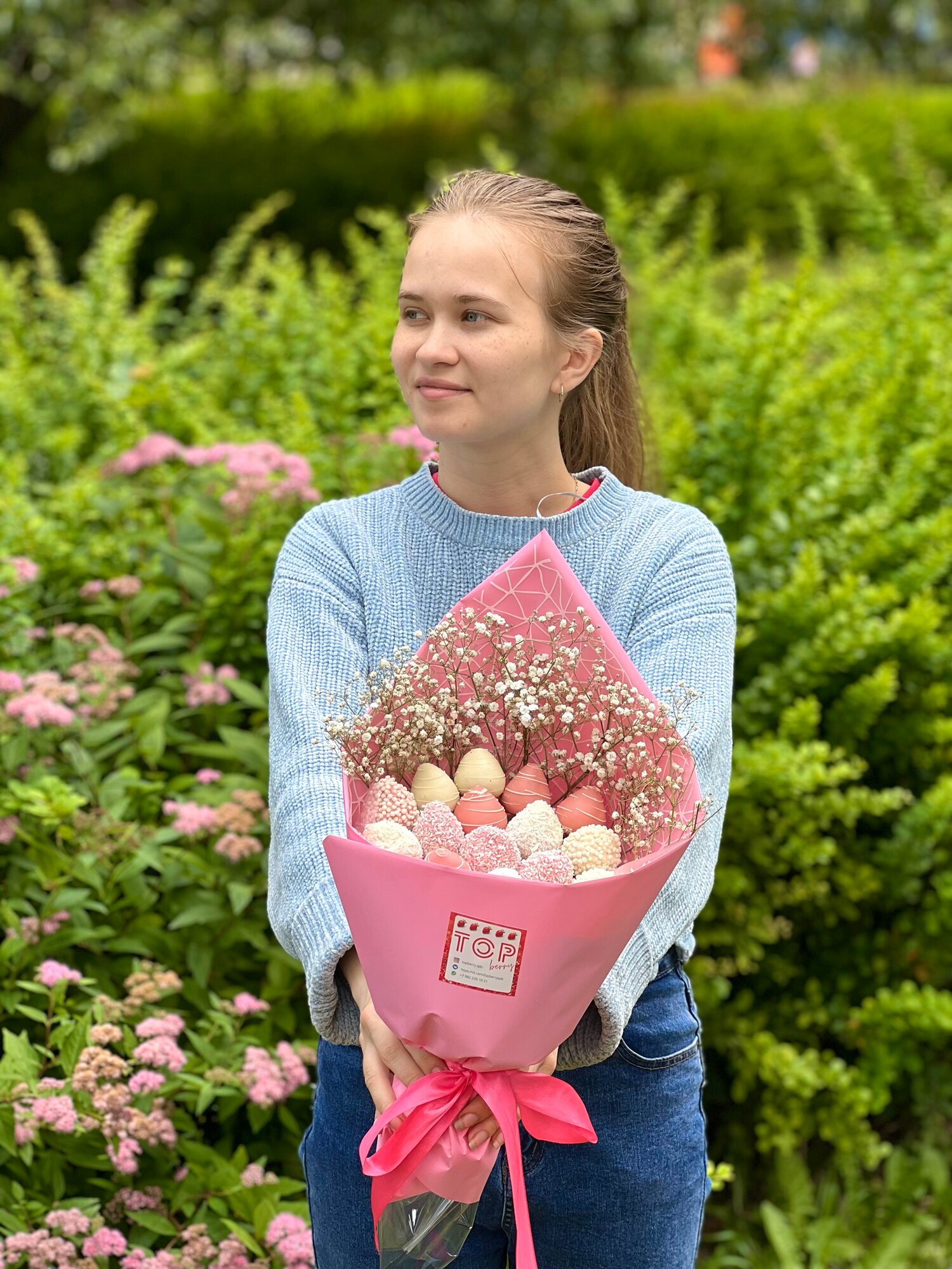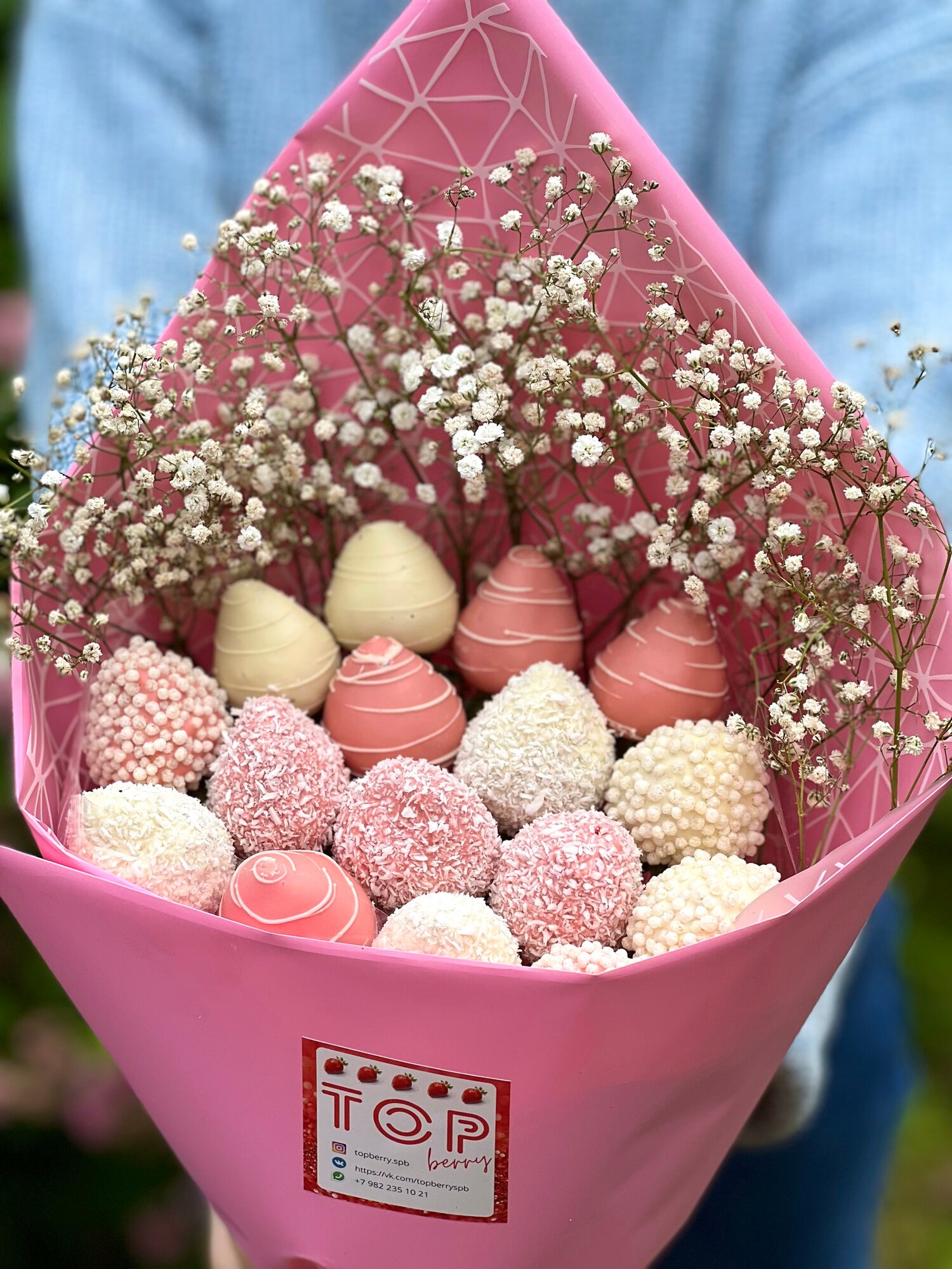 Букет из клубники в шоколаде с белой гипсофилой №20 интересное: