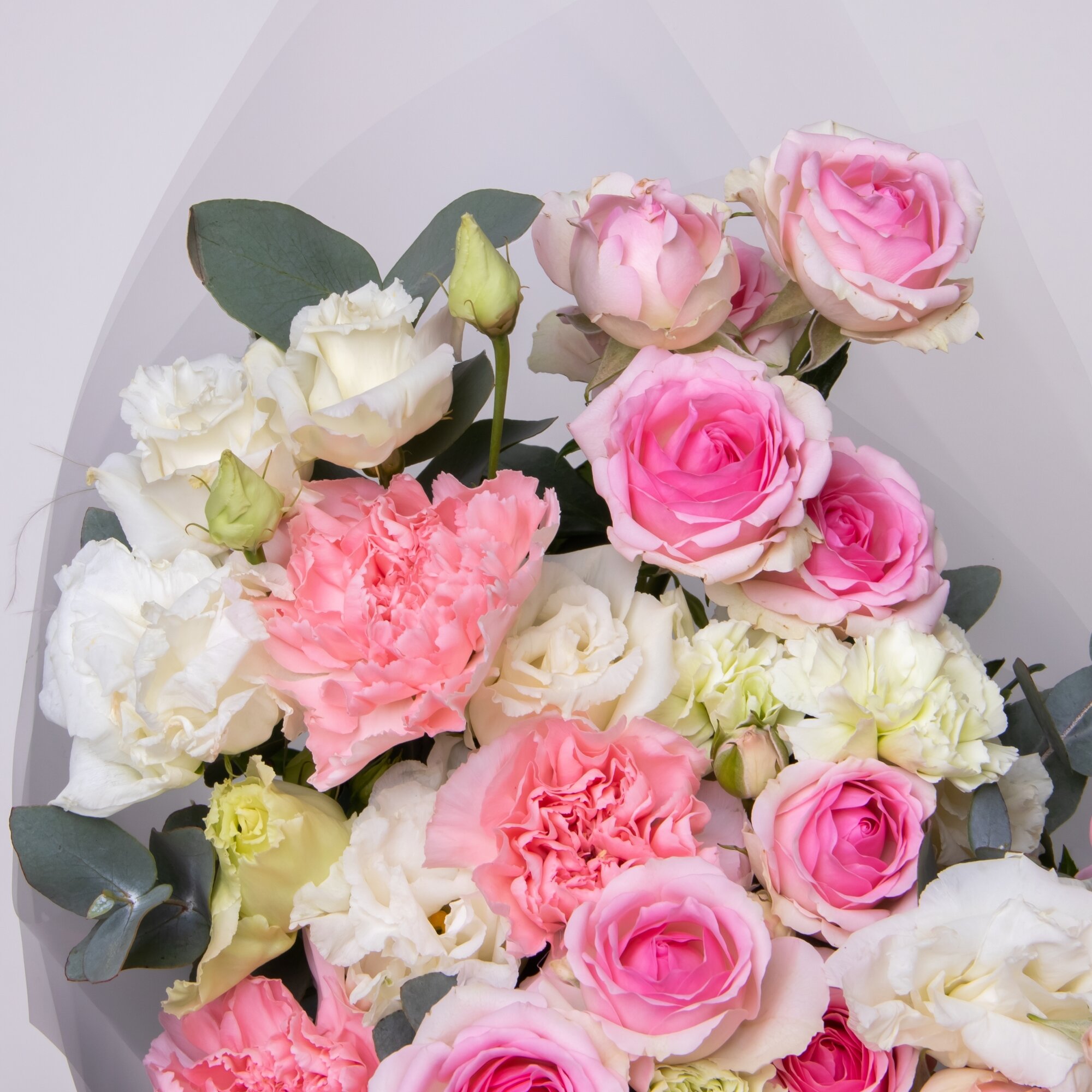 | Состав | Лизиантус-3;Гвоздика-3;Эустома-3;Роза кустовая-3;Гвоздика кустовая-3;Листья фисташки-2;Листья эвкалипта-3;Стифа-1; |