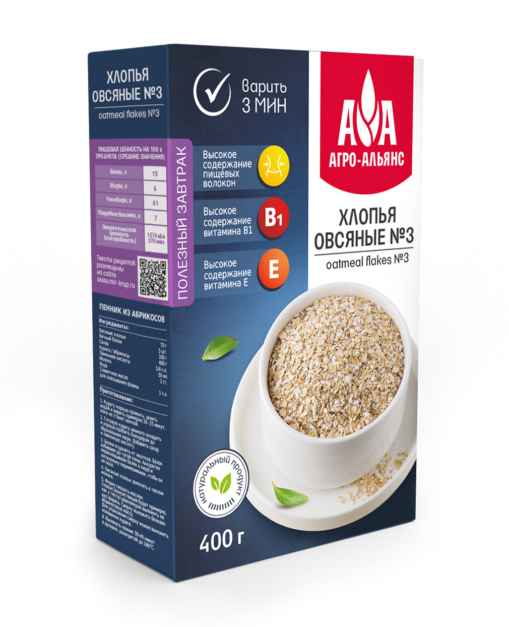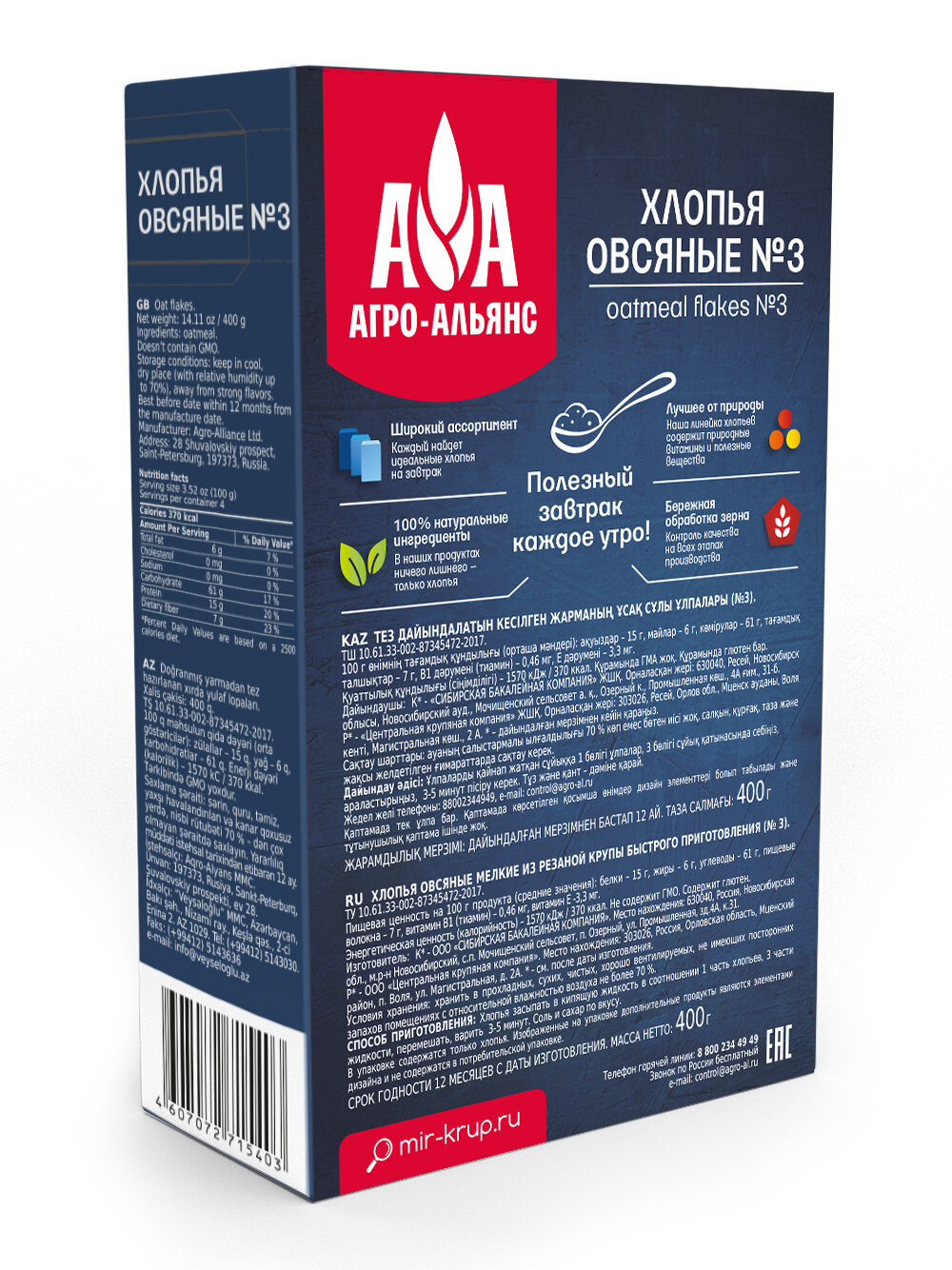 Хлопья овсяные №3 (мелкий размер) "Агро-Альянс Экстра" 400 г
