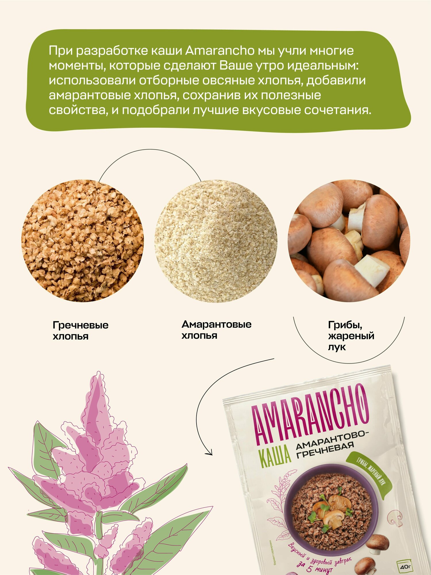 | Состав | Хлопья амарантовые и гречневые, масло подсолнечное, бульон овощной (мальтодекстрин, сахар, сушёные овощи: морковь, сельдерей, лук, пастернак, растительное масло, ароматизатор пищевой натуральный, зелень петрушки, куркума молотая, красители натуральные карамельный колер и рибофлавин (витамин В2) соль), грибы сушёные, овощи сушёные (лук жареный (лук, масло растительное), чеснок, морковь, лук зелёный), ароматизаторы натуральные «Лук жареный», «Овощи», и «Грибы». |