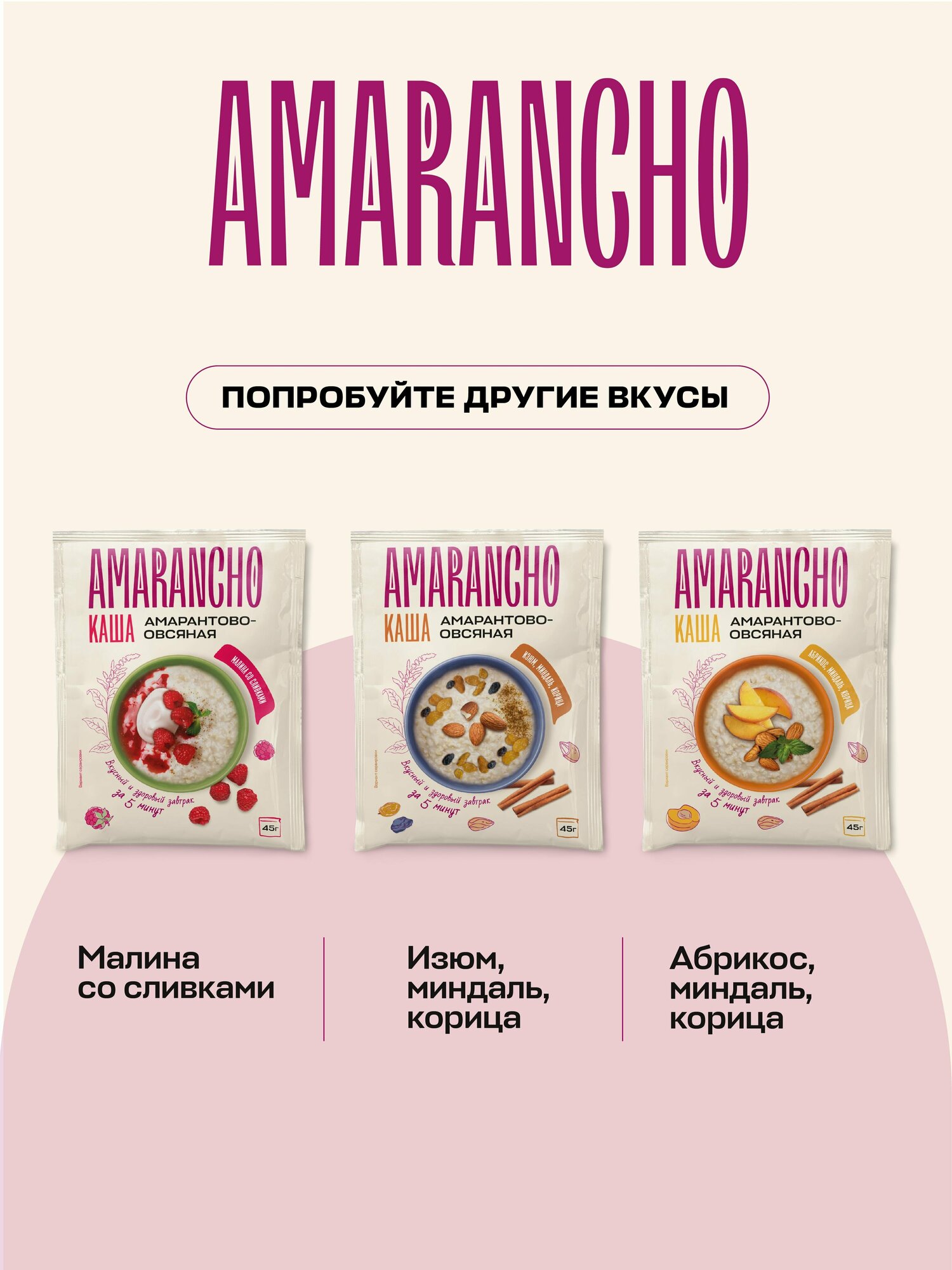 Каша амарантово-овсяная малина со сливками "Amarancho", быстрого приготовления, 10 пакетиков по 45 г