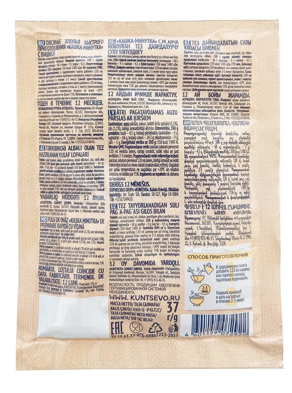 | Способ приготовления | к содержимому пакета добавить 120 мл кипятка или горячего молока / тщательно перемешать / накрыть крышкой и дать настояться в течении 2-5 минут |