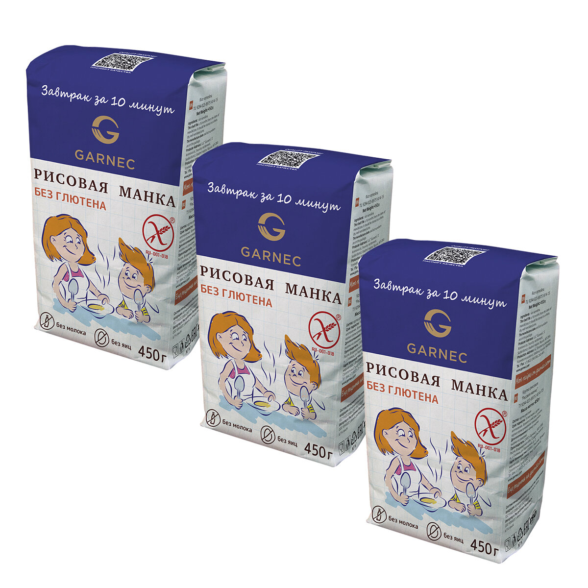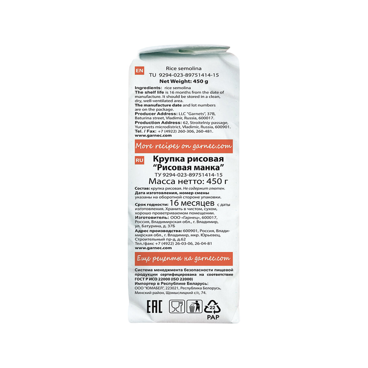 Крупка Гарнец Рисовая манка без глютена, 3 шт по 450 гр, Garnec