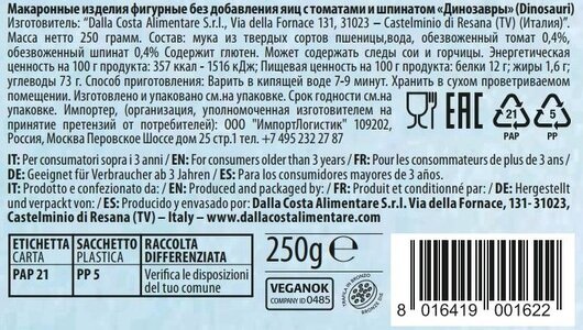 Макаронные изделия Dalla Costa Динозаврики, Фигурные со шпинатом и томатами, 250 г интересное:
