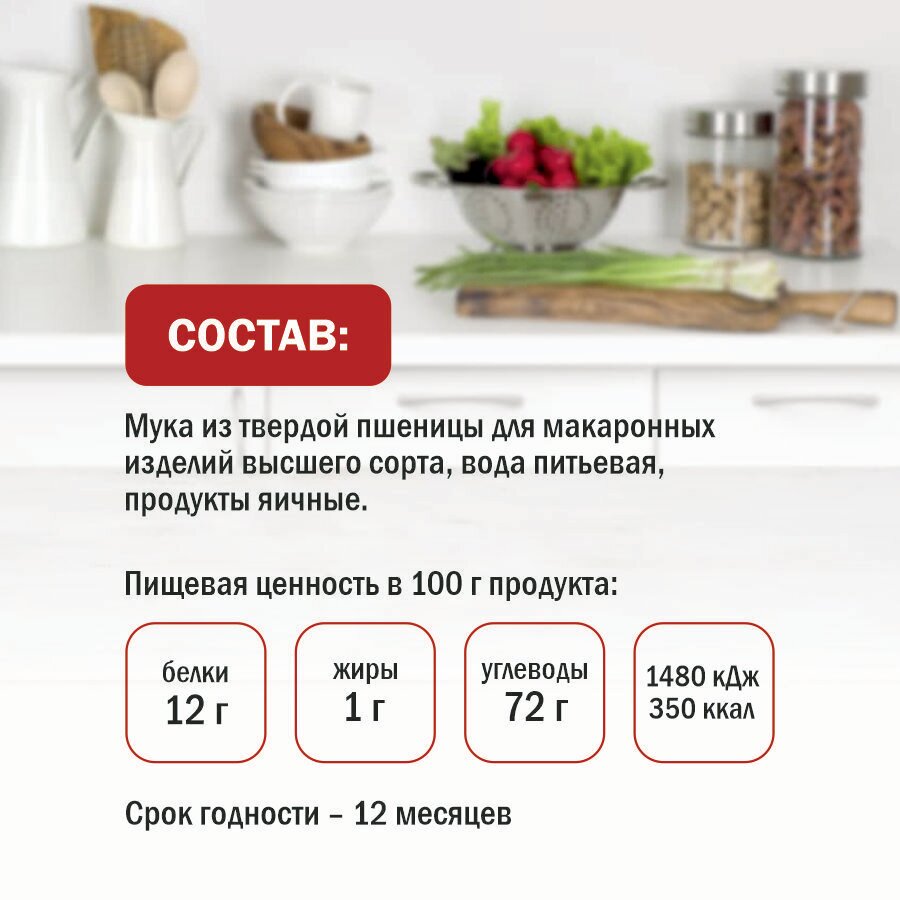 | Состав | Мука из твердой пшеницы для макаронных изделий высшего сорта, вода питьевая, продукты яичные |