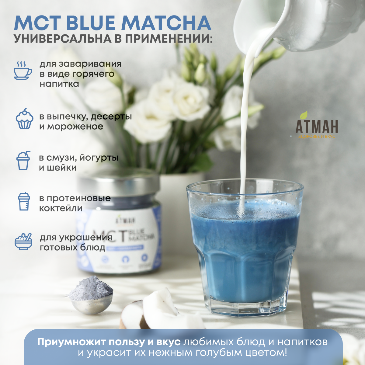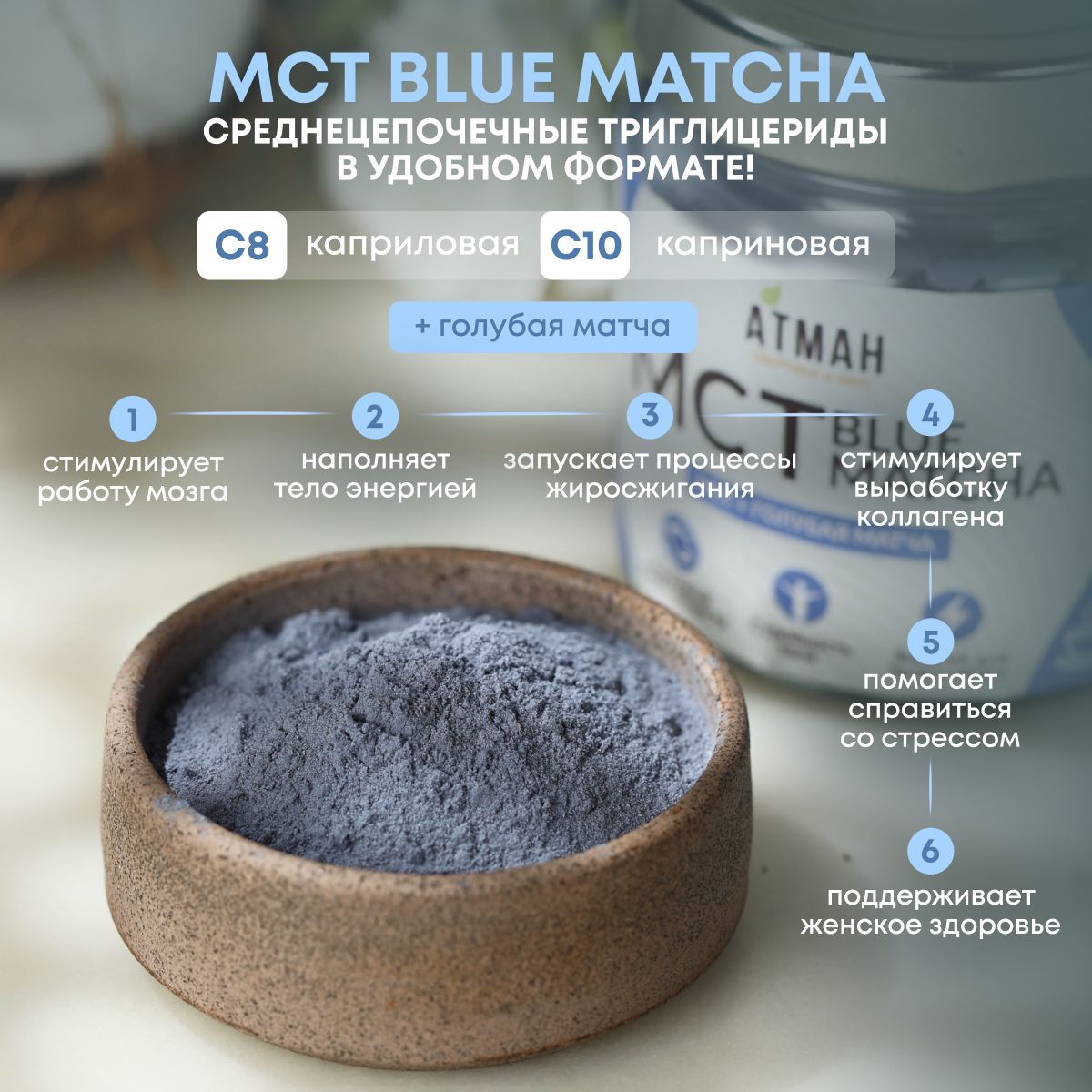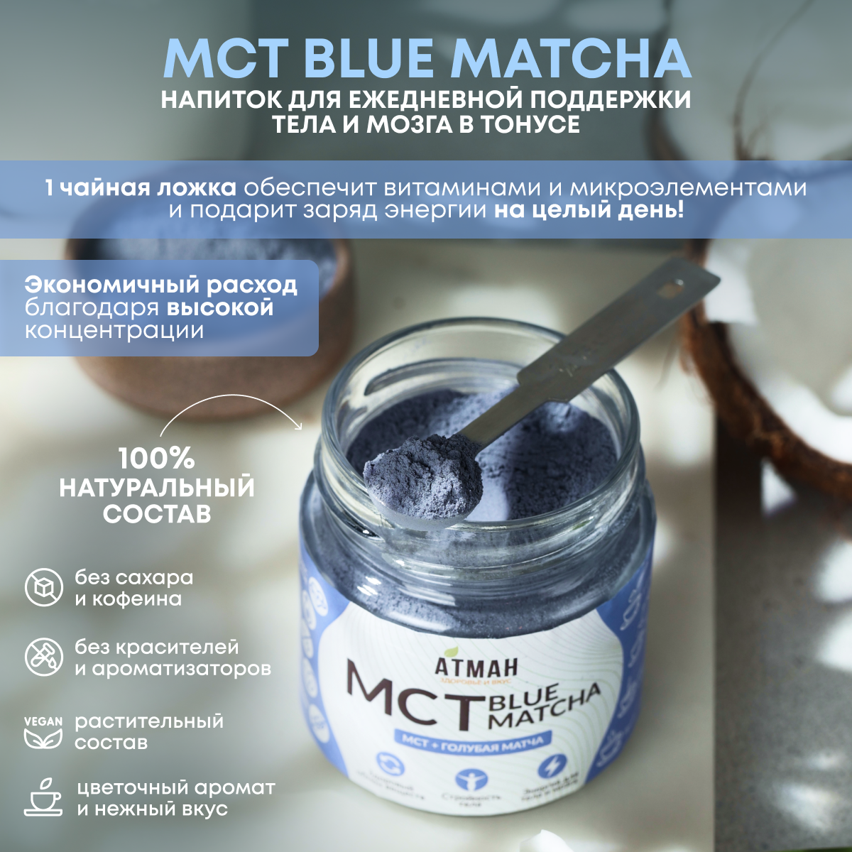 Купить MCT POWDER с голубой матчей, масло кокосовое мст пудра с добавками, мст порошок, 100 гр