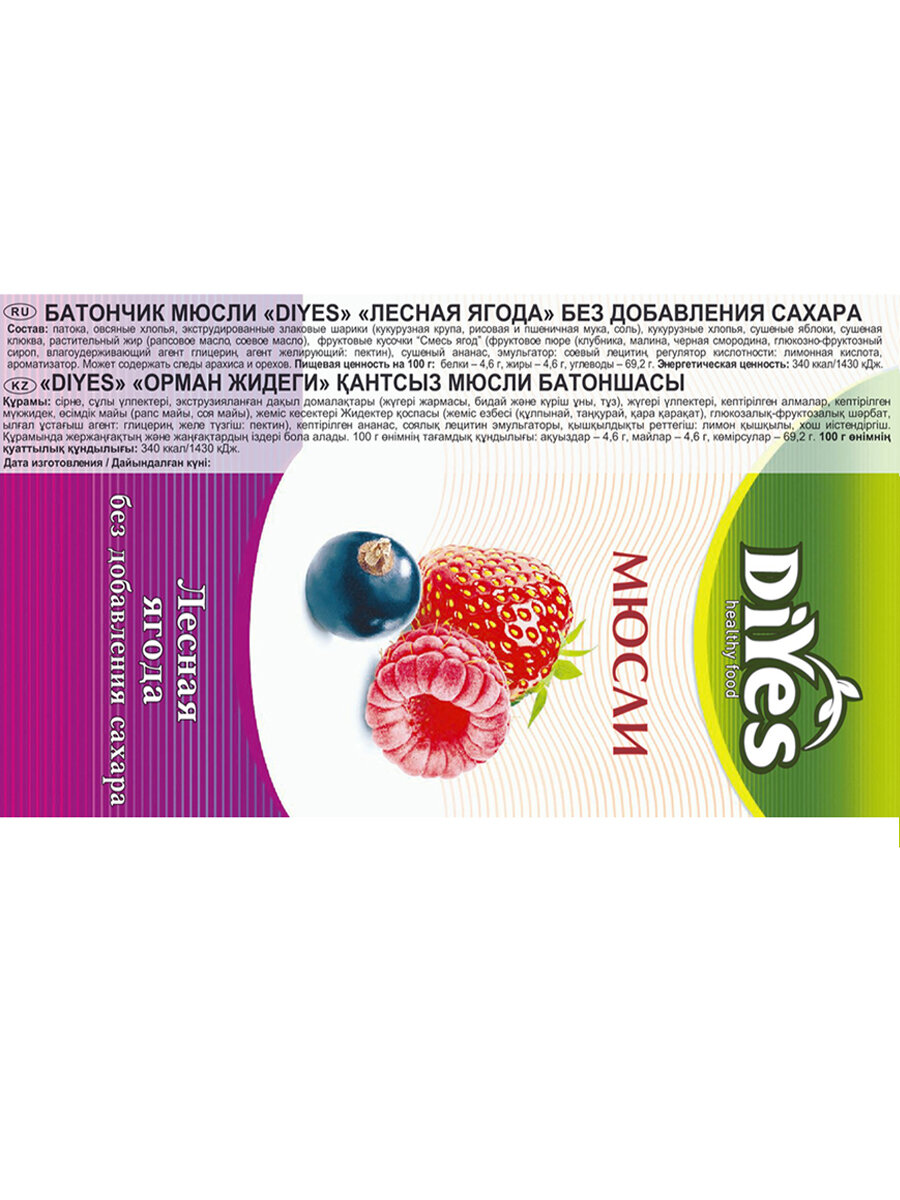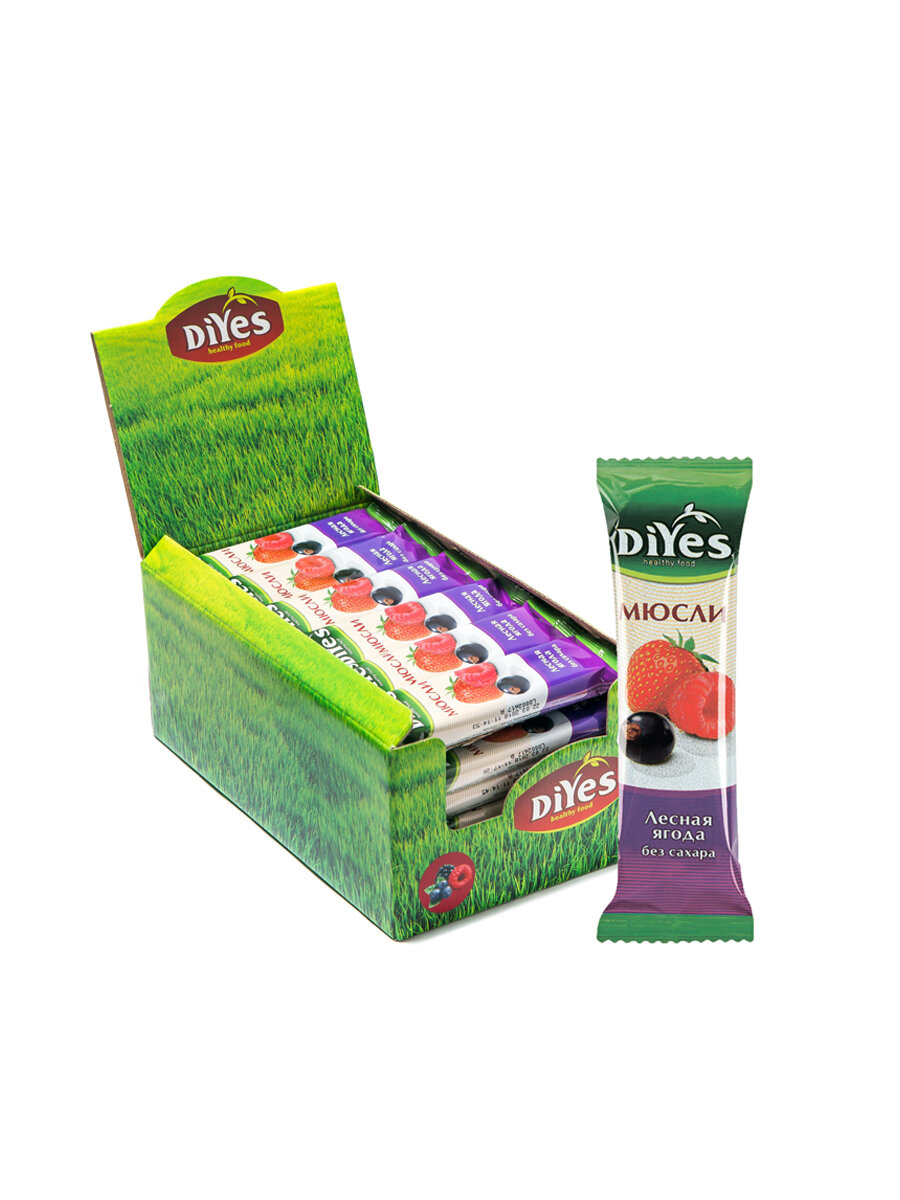 Купить Батончик мюсли без сахара "Лесная ягода" от DiYes 36 шт - идеальный выбор для веганов и вегетарианцев!