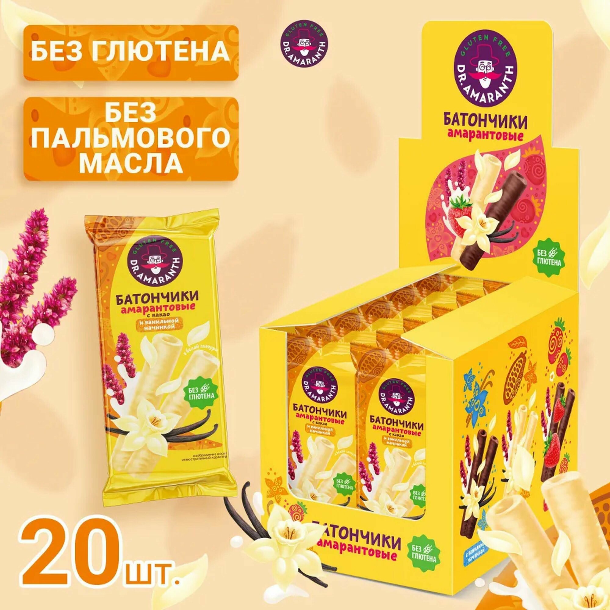 Батончики амарантовые DR.AMARANTH без глютена с какао и ванильной начинкой в белой глазури, 20 шт по 19 г интересное: