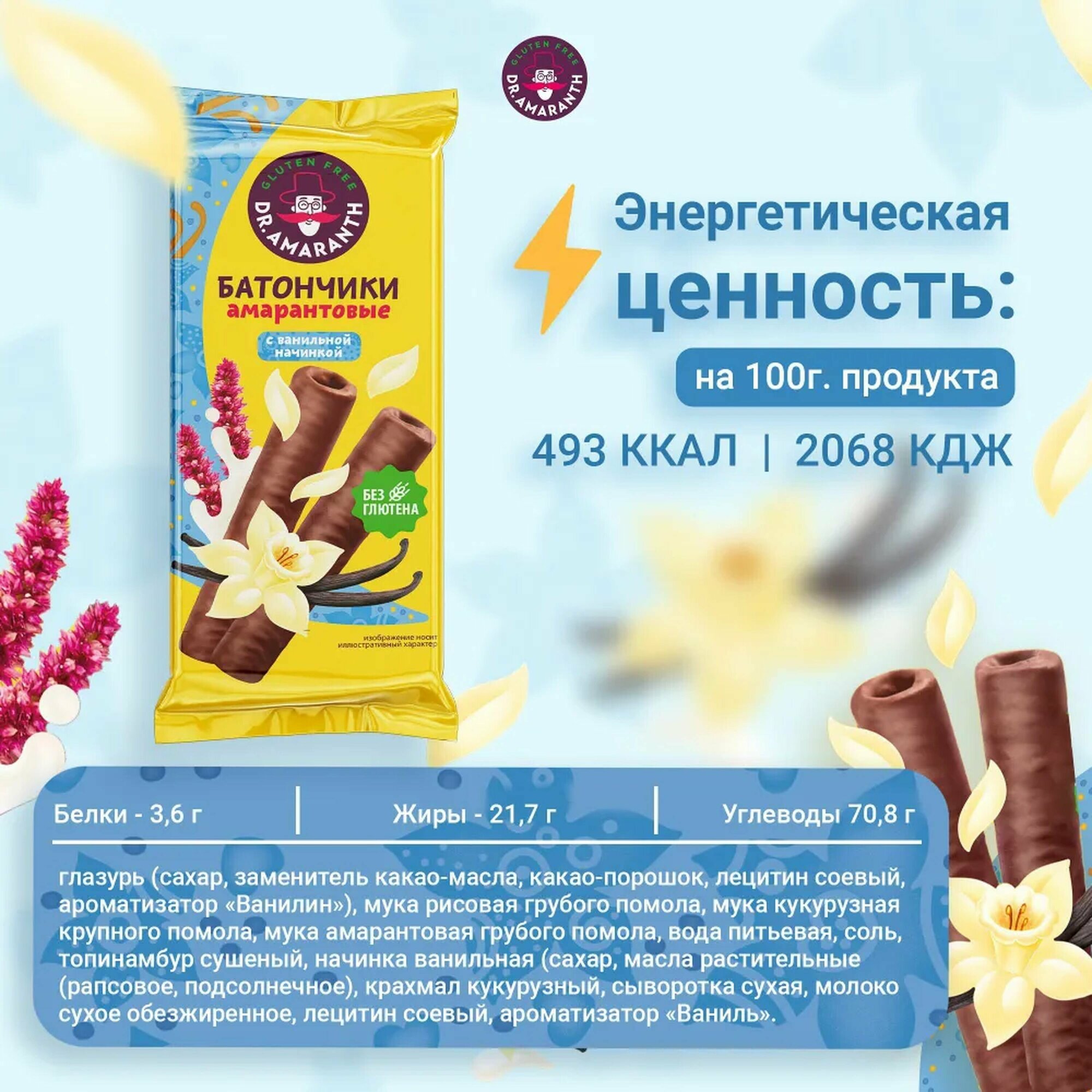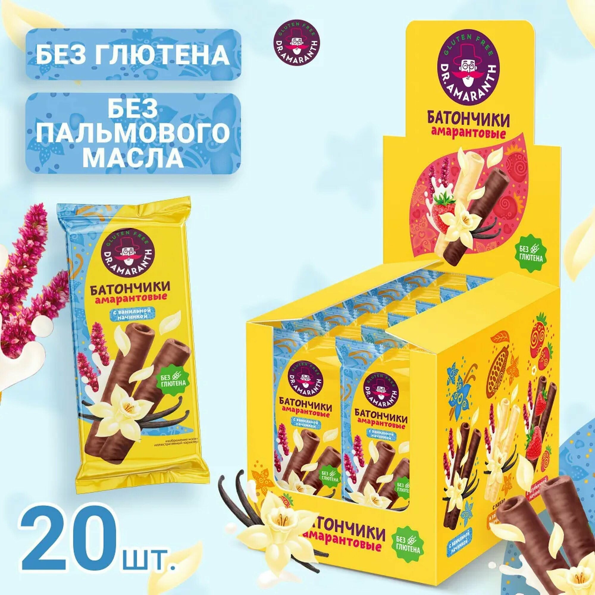 Батончики амарантовые DR.AMARANTH без глютена с ванильной начинкой в глазури, 20 шт по 19 г интересное: