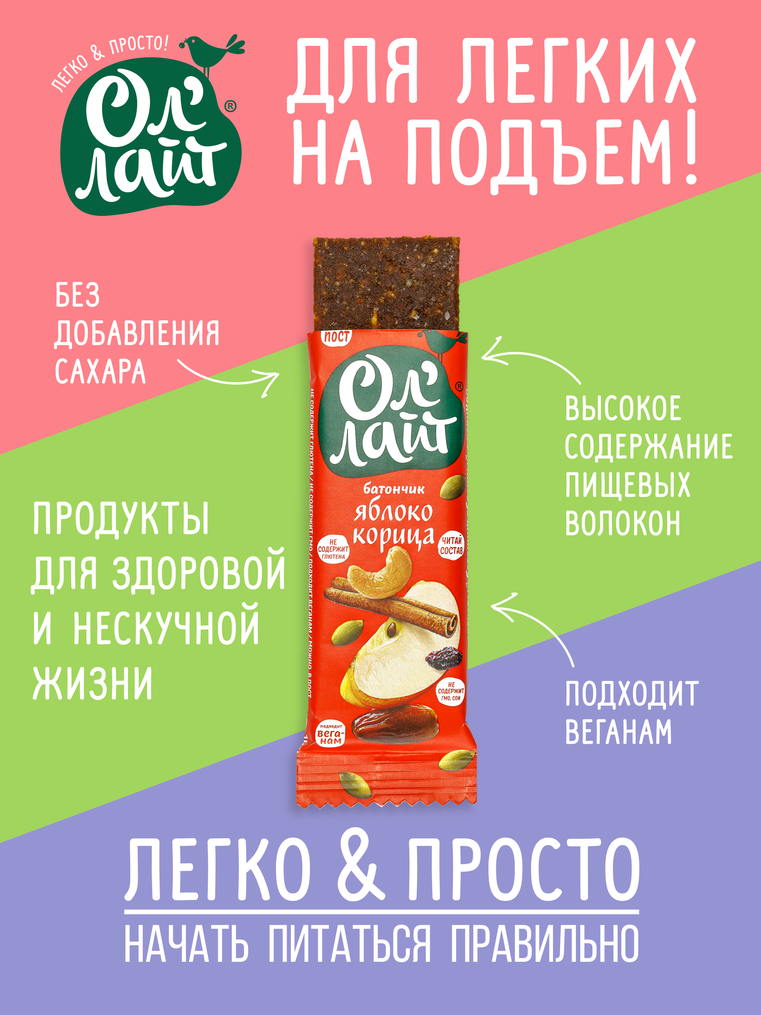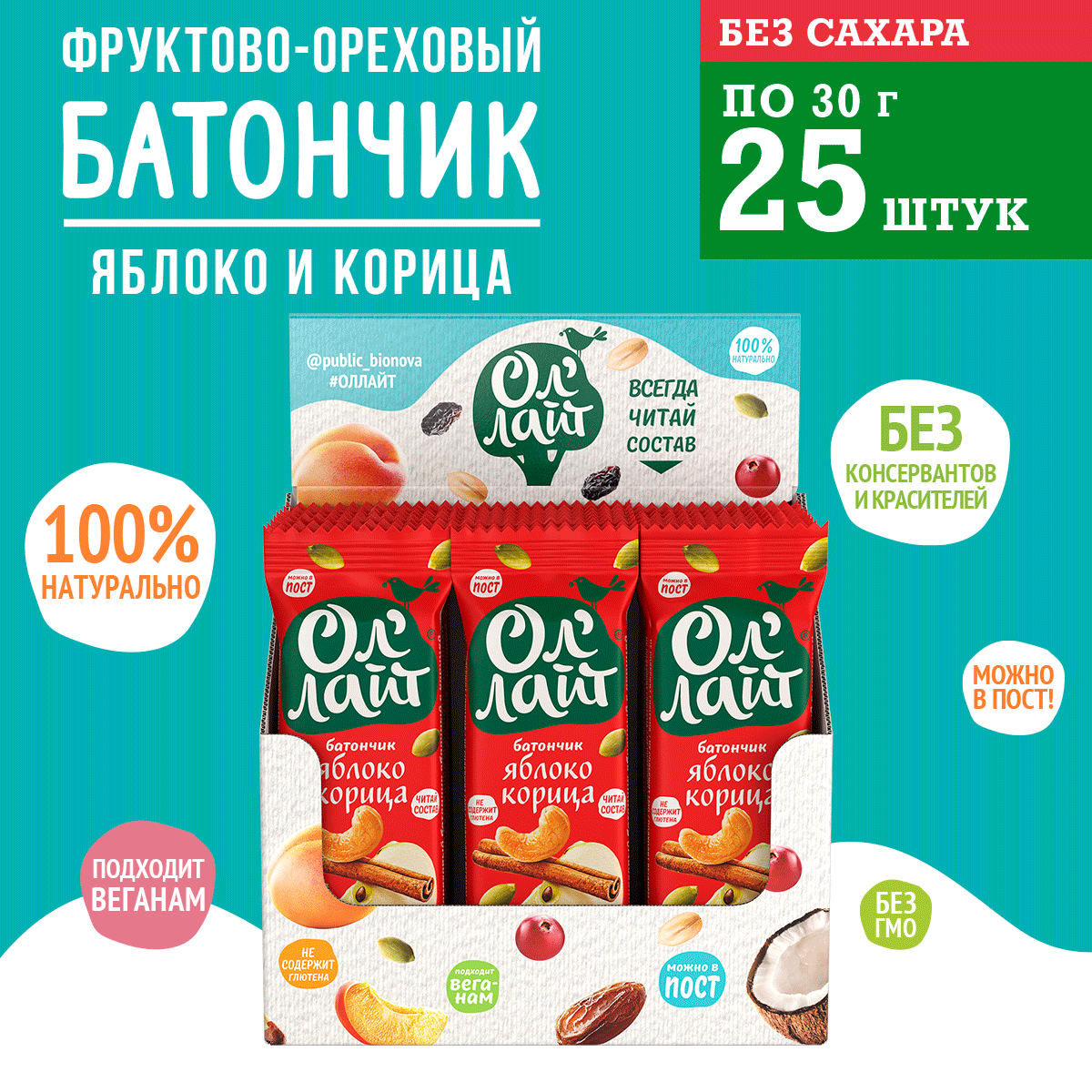 Батончик фруктово-ореховый Ол'Лайт Яблочный с корицей 30г по 25 шт интересное: