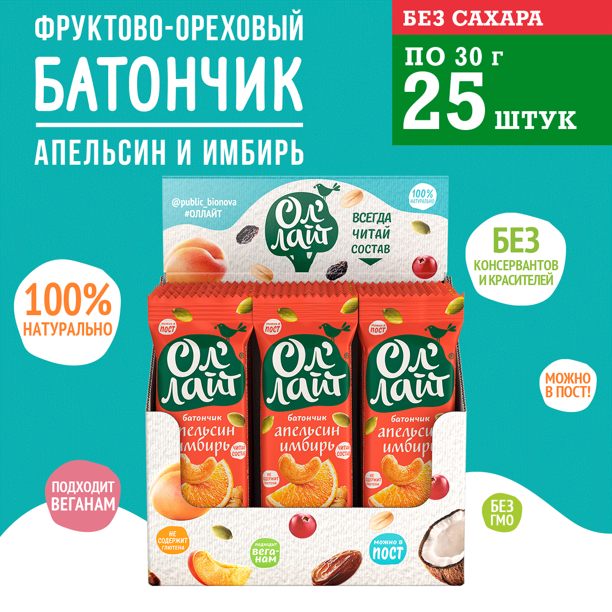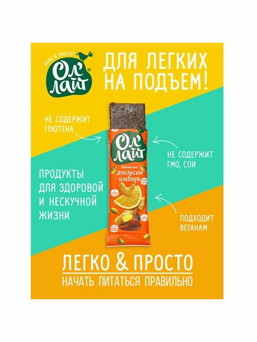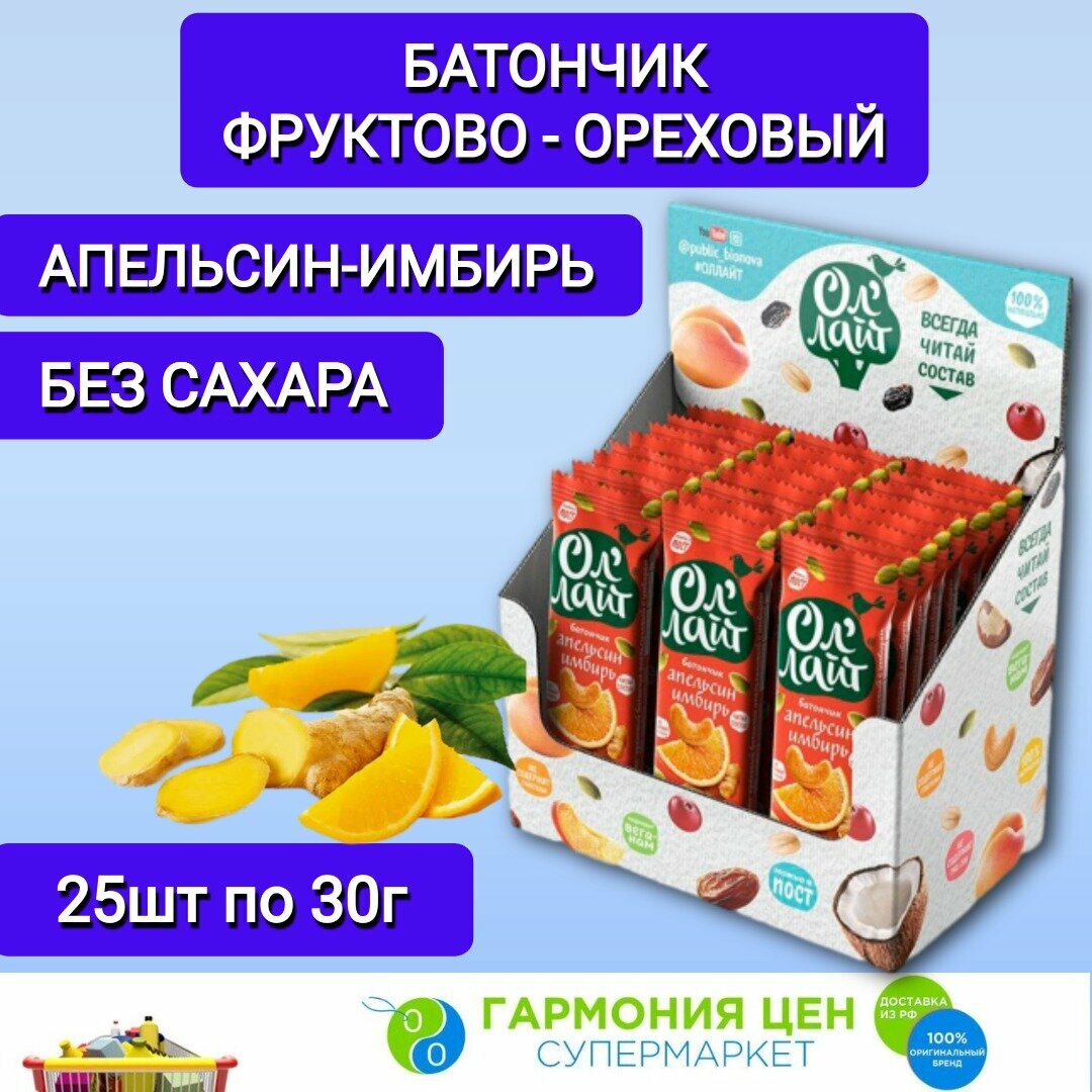 Батончик фруктово-ореховый Ол'Лайт Апельсиновый с имбир 30г по 25 шт интересное: