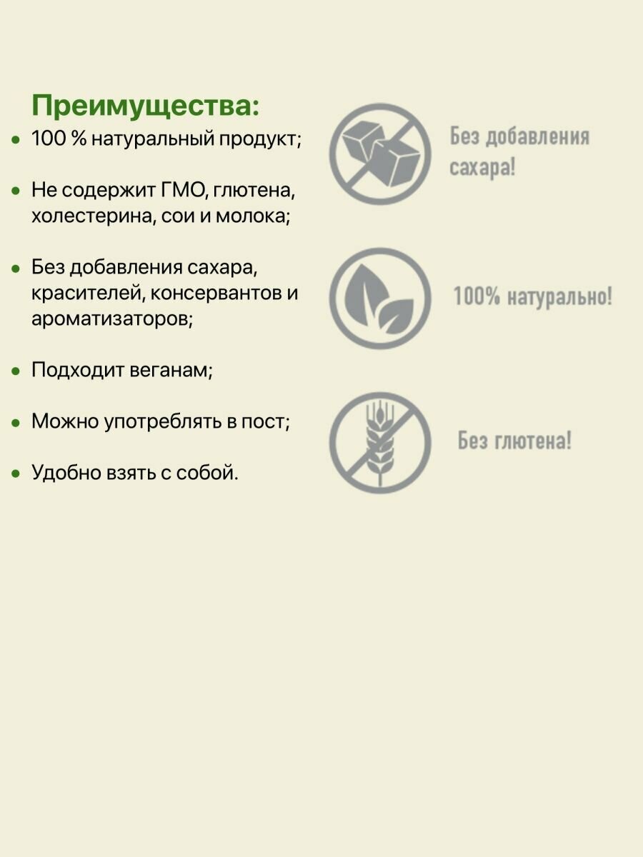 | Не содержит | ГМО, ароматизаторы, глютен, искусственные добавки, искусственные красители, консерванты, пальмовое масло, сахар |
