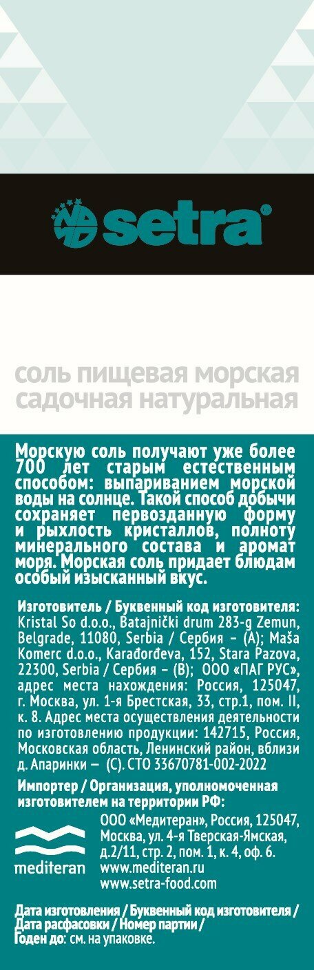 Соль SETRA морская натуральная 500г