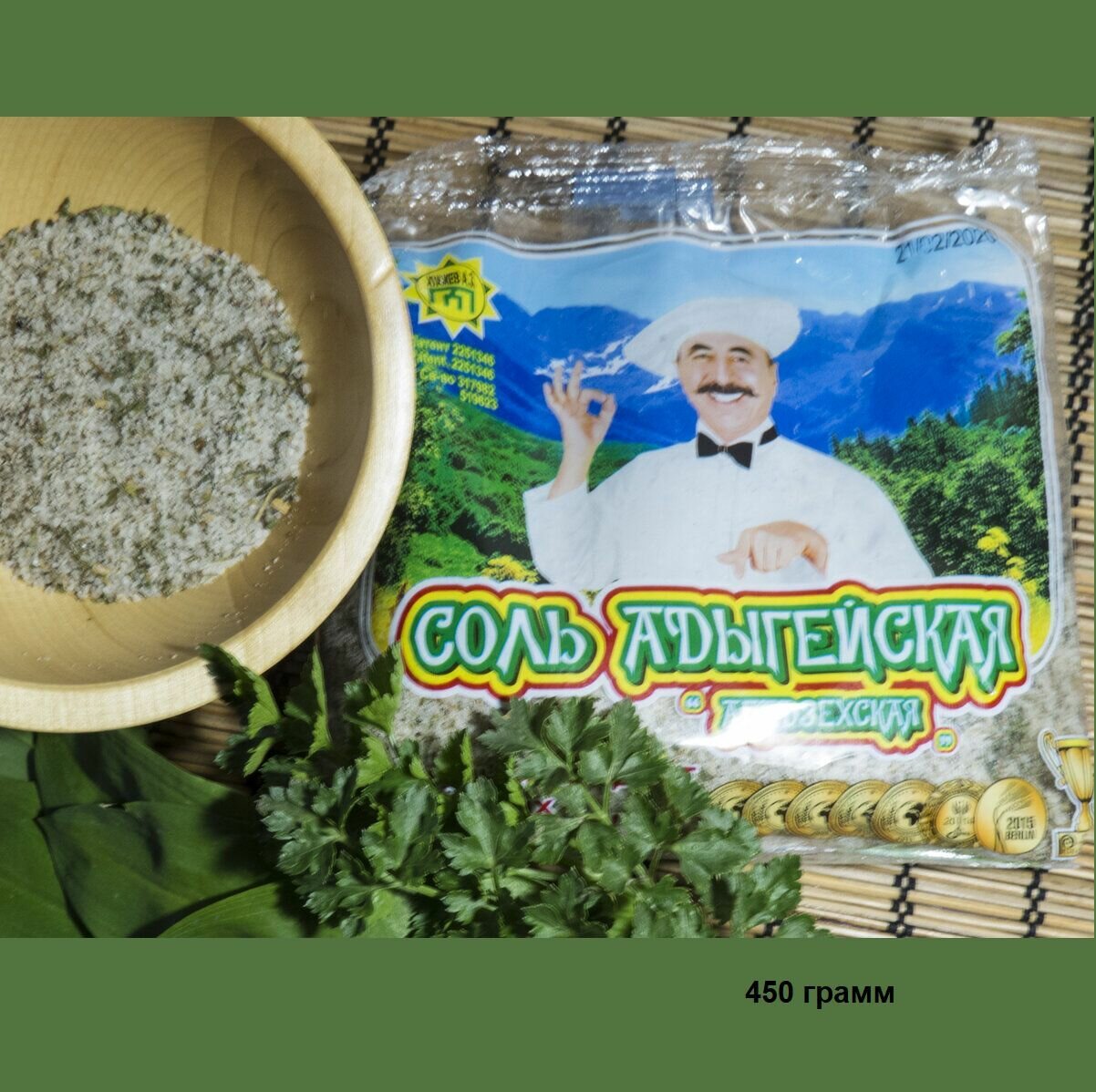 | Состав | Соль поваренная пищевая , чеснок, кориандр, перец черный, чабер,укроп,петрушка. |
