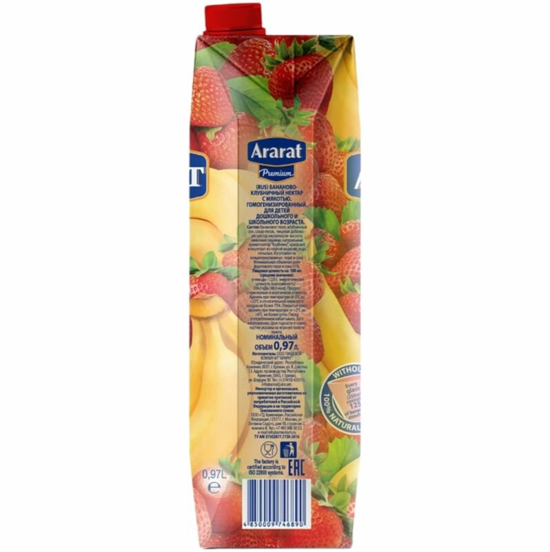 | Состав | банановое пюре, клубничный сок, сахар-песок, регулятор кислотности — кислота лимонная пищевая, идентичный натуральному пищевой ароматизатор «банан», идентичный натуральному пищевой ароматизатор «клубника», натуральный пищевой краситель «черная морковь», вода питьевая |