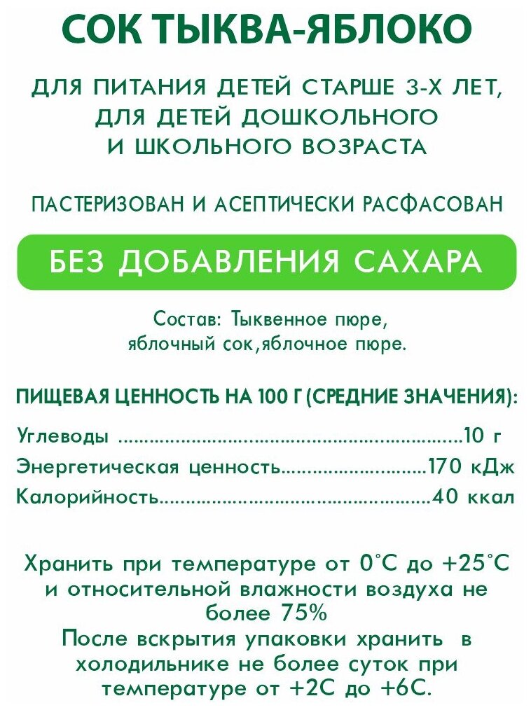 | Состав | яблочный сок, тыквенное пюре, регулятор кислотности лимонная кислота, вода |