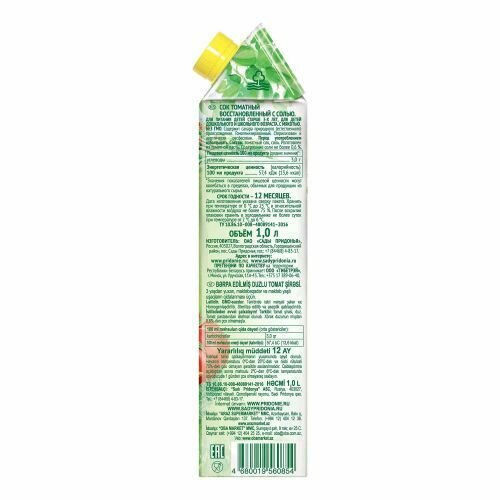 | Состав | томатный сок, поваренная соль, изготовлен из томатной пасты, содержание поваренной соли не более 0.6% |