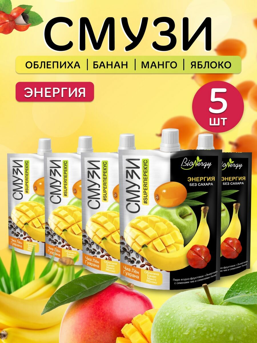 Смузи Энергия без сахара Чиа, лен, гуарана (манго, банан, облепиха, яблоко) BioNergy, 10 шт по 120 гр