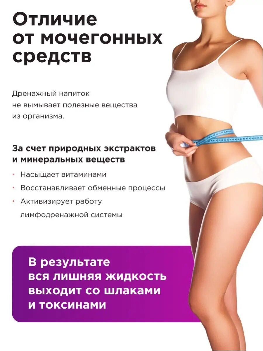 | Дополнительная информация | Для достижения эффективного результата, рекомендуется пропить курс, который составляет от 3-4 недель. В этот период важно поддерживать водный баланс и пить в среднем от 3-4 л воды в сутки. Как только вы восстановите нормальный питьевой режим, организм начнет выводить воду из подкожной жировой клетчатки. |