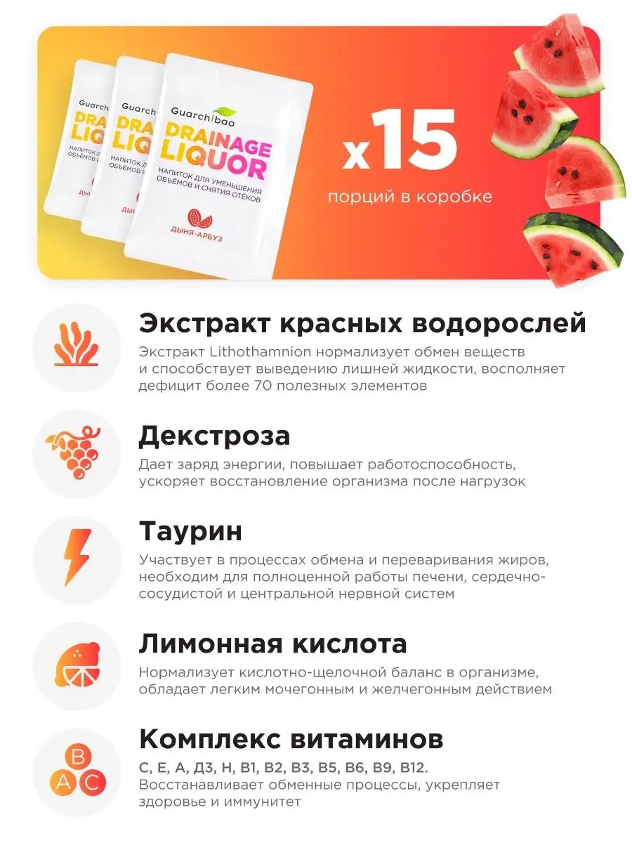 Купить Дренажный напиток Guarchibao Drainage Liquor со вкусом Арбуза и Дыни для снятия отеков и уменьшения объемов, для похудения, 1 упаковка (15 саше)