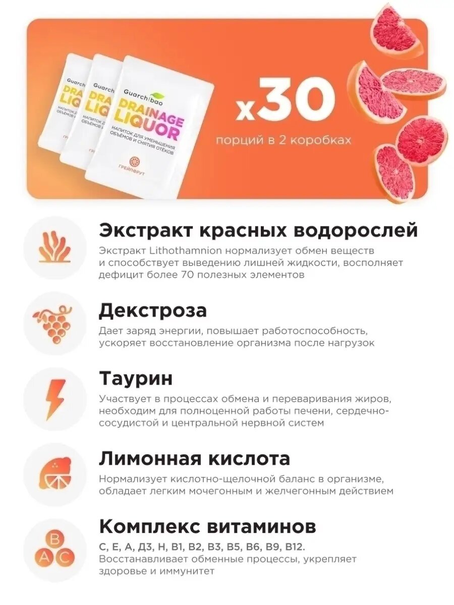 Купить Дренажный напиток Guarchibao Drainage Liquor со вкусом Грейпфрута для снятия отеков и уменьшения объемов, для похудения, 2 упаковки (30 саше)